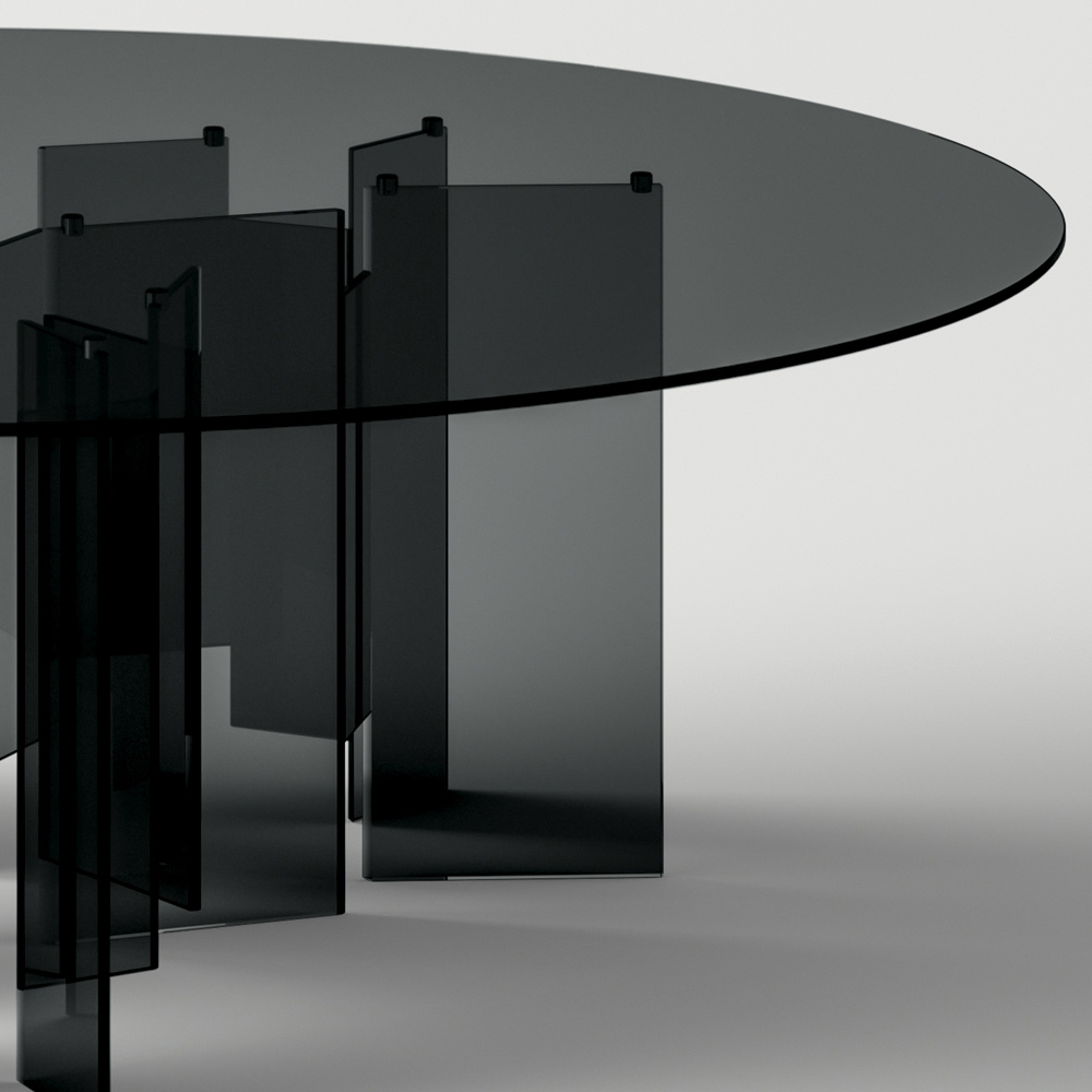 Dining table completely made of glass with basis of shapes geometric which supports an elegant round top . A furnishing solution that comes from a Made in Italy production process through the expert processing of glass by skilled craftsmen who allow to give life to the perfect combination of quality , design and functionality .