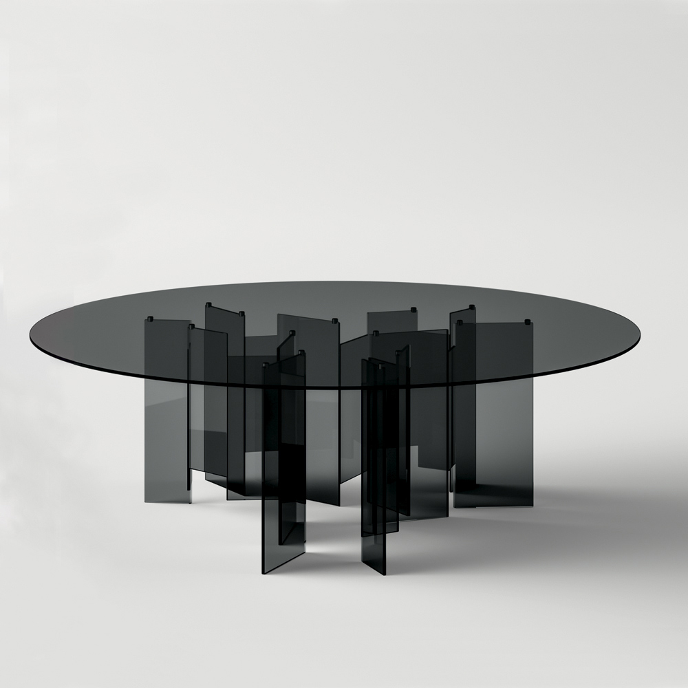 The choice to use a simple material such as glass but at the same time with a strong visual impact characterises the entire aesthetics of the product making it original , contemporary and elegant , ideal for those looking for a furnishing solution capable of completing the living area of the house with modern and imposing personality . Visually what is striking is undoubtedly the particular shape of the base which is made up of numerous glass plates joined asymmetrically to give the table a sense of dynamism together with an exclusive and refined touch .