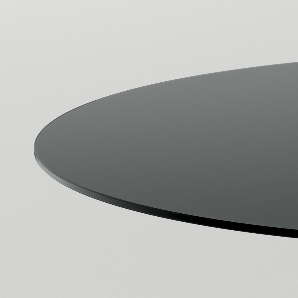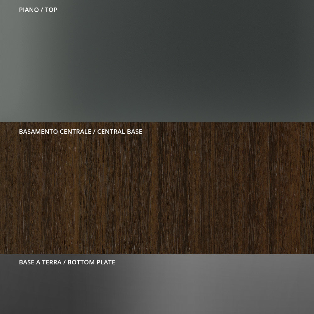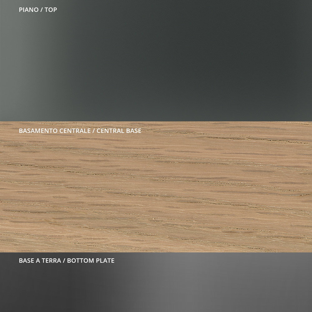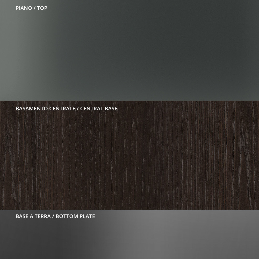 metal base with a shiny gunmetal grey finish. The top with its rounded edge gives softness to the shapes, while the metal elements complete the design of the table, enriching it with