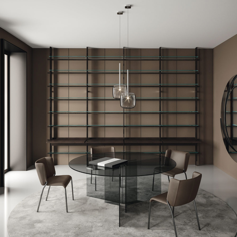 Dining table completely made of ultra- resistant glass with round top . A complement with a refined character that comes from a 100% Made in Italy production process thanks to skilled craftsmen expert in glass processing, a single material that gives life to a precious design table.