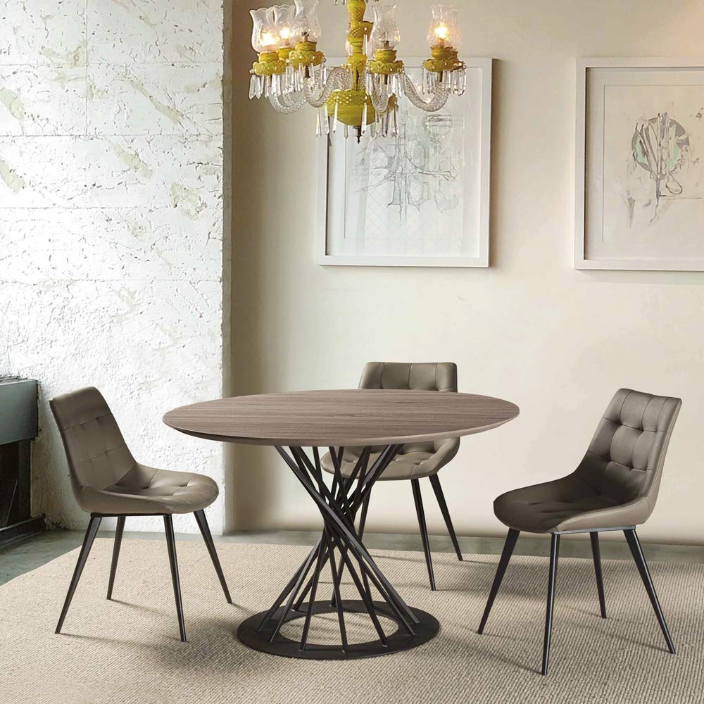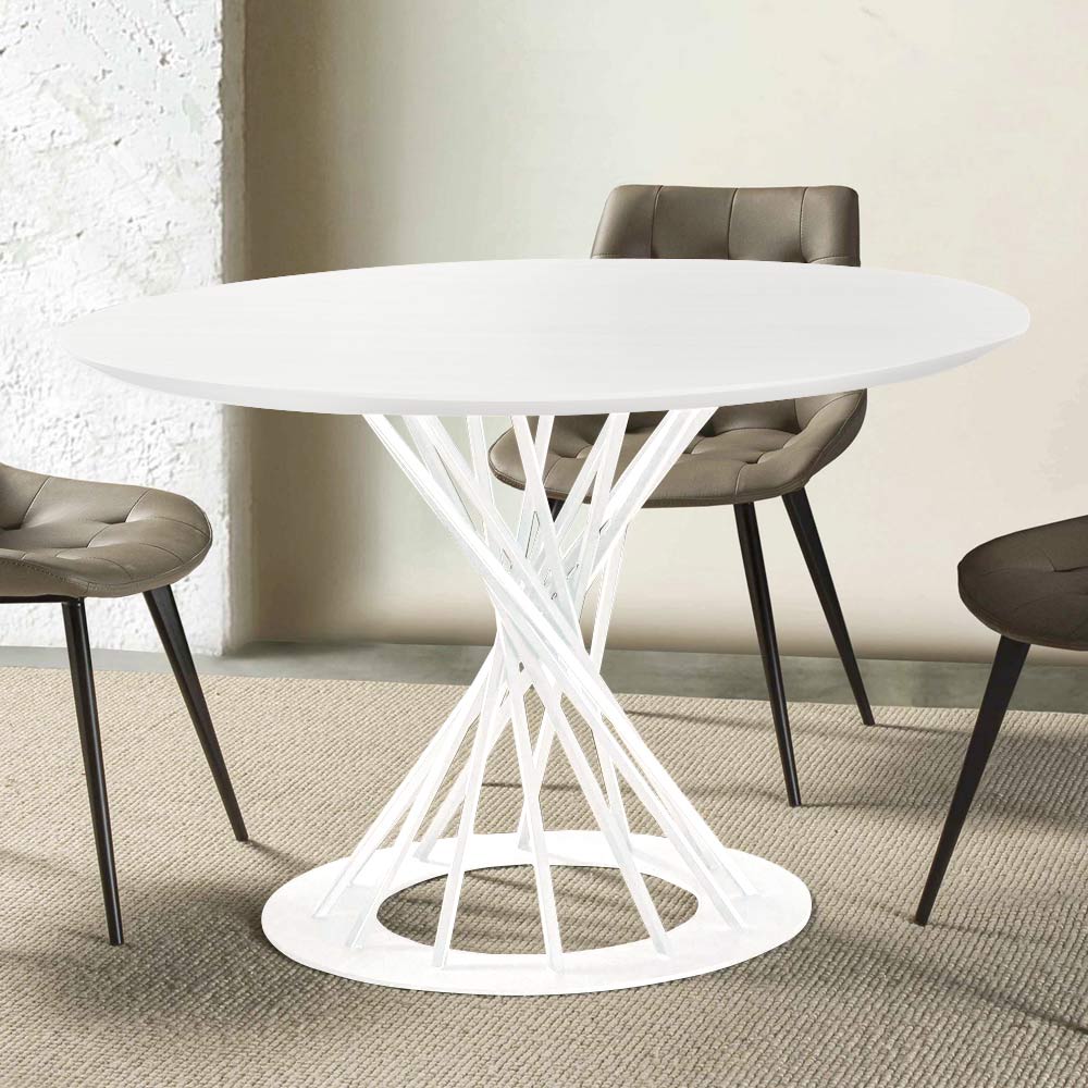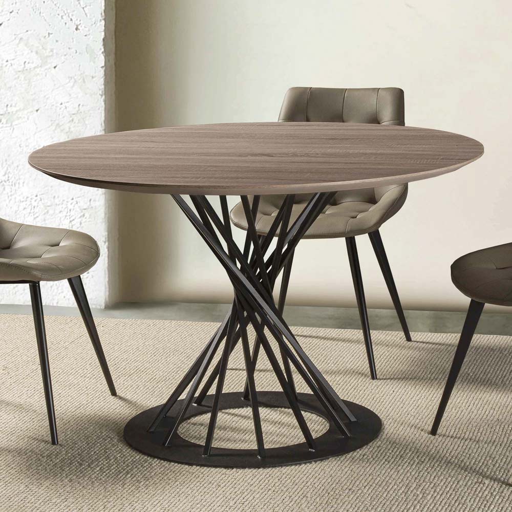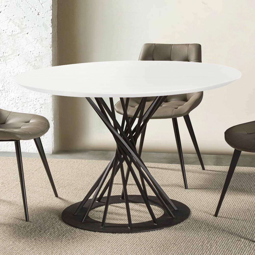 Modern dining table with round laminated wood top (h 30 mm) Ā  with flared edge Ā  and base in painted steel . The wonderful combination of these two materials contributes to giving life to an elegant article characterized by contained dimensions that make it a perfect choice for those who have small spaces available but do not want to give up a modern article characterized by an innovative and avant-garde style . The particular structure of the base together with the choice of the round top give the product a splendid harmony between the shapes and a sense of movement which together with the available finishes make the table unique and with a strong contemporary character .