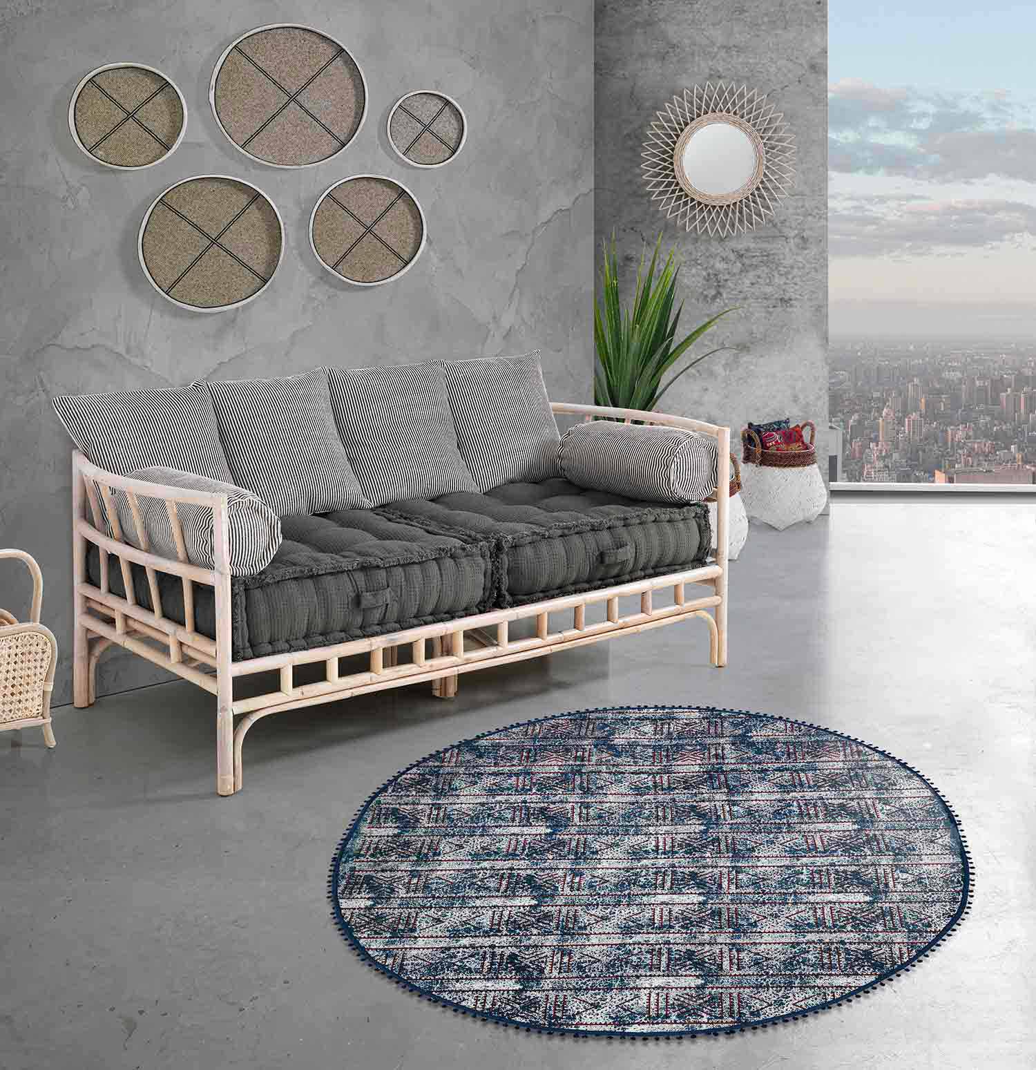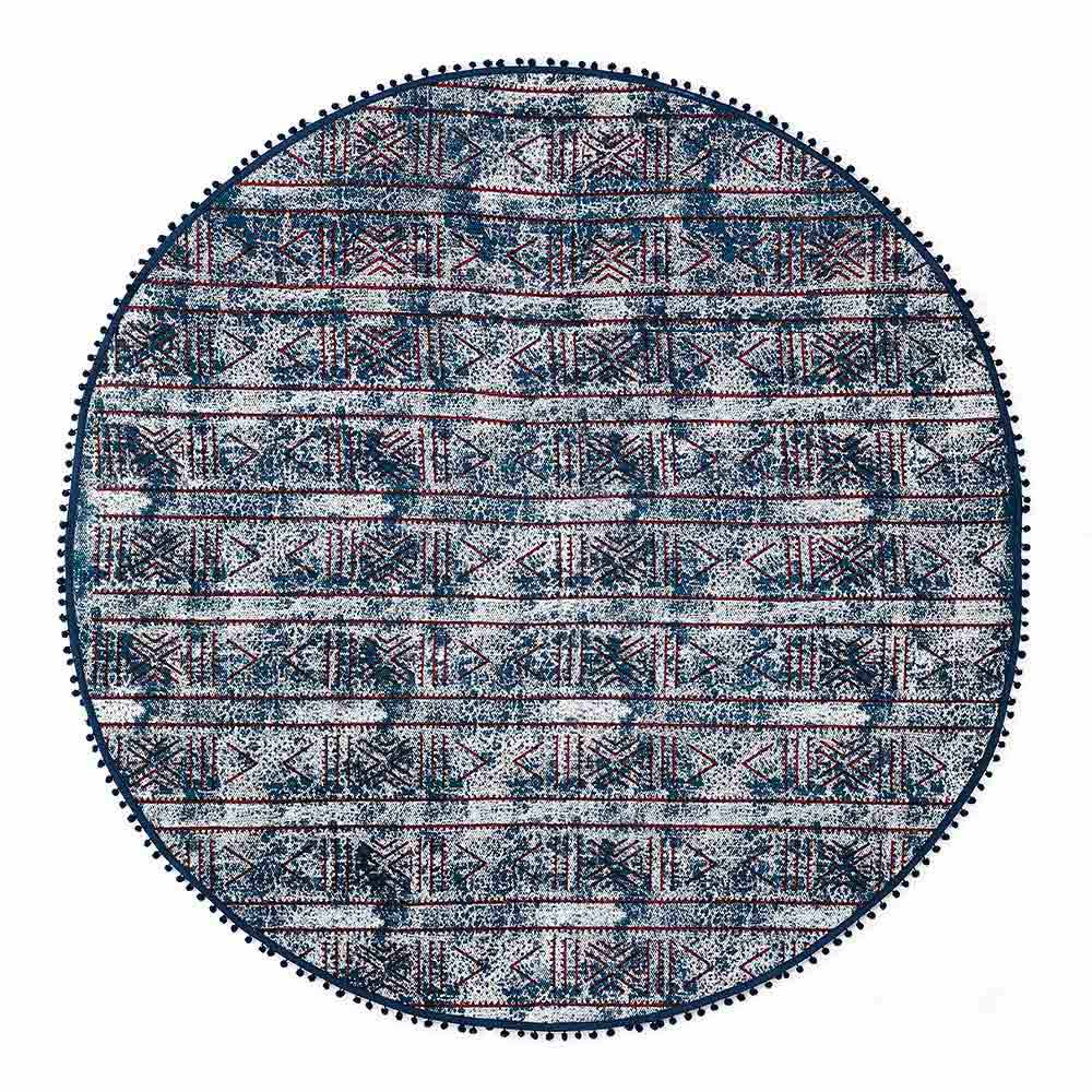 Round ethnic design rug in kilim cotton fabric.