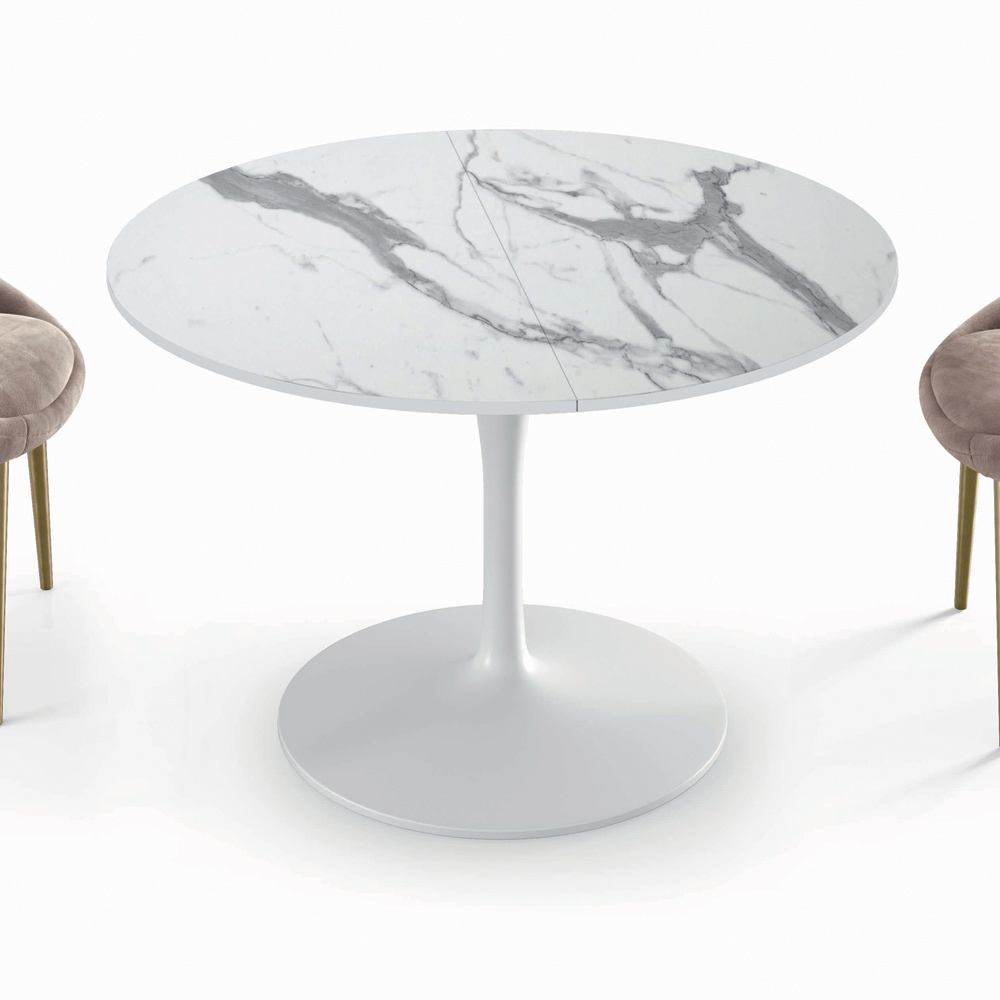 Extendable lounge table with separate extensions to insert, laminate top with matt statuary finish, 45° bevelled edge, base in