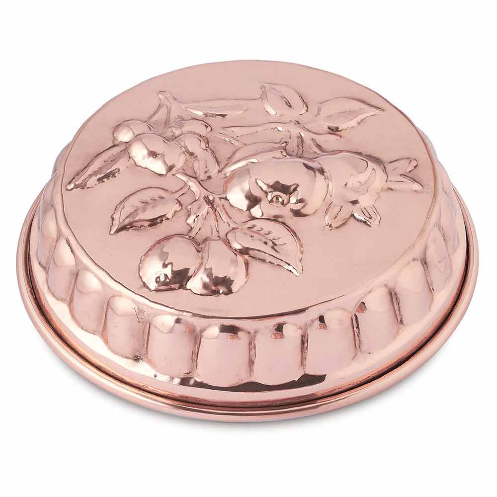 Round baking pan with fruit decoration in hand made in Italy tinned copper.