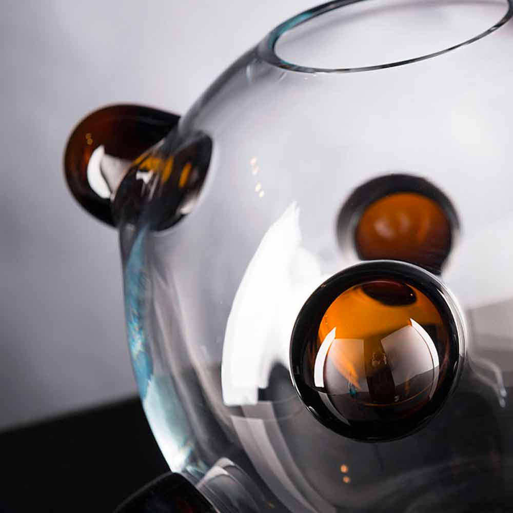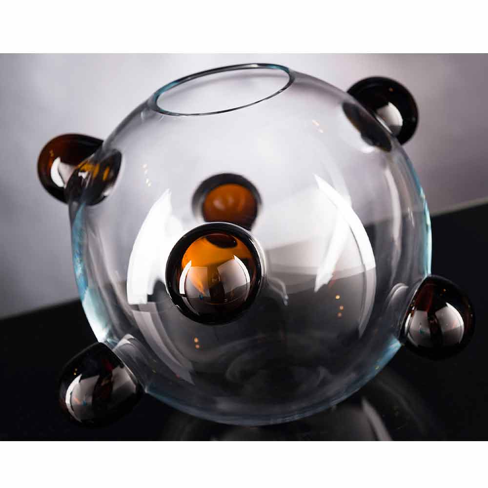 Indoor decorative vase with a spherical shape in transparent Murano blown glass with colored details made entirely in Italy . An innovative furnishing idea capable of embodying the peculiarities of Murano glass and a revolutionary design characterized by exclusive and avant-garde touches of color for a lively result with a strong scenographic impact . An ideal style for the most varied environments, from home furnishings to that of hotels, restaurants, contract areas, spas but also as a setting for events and weddings.