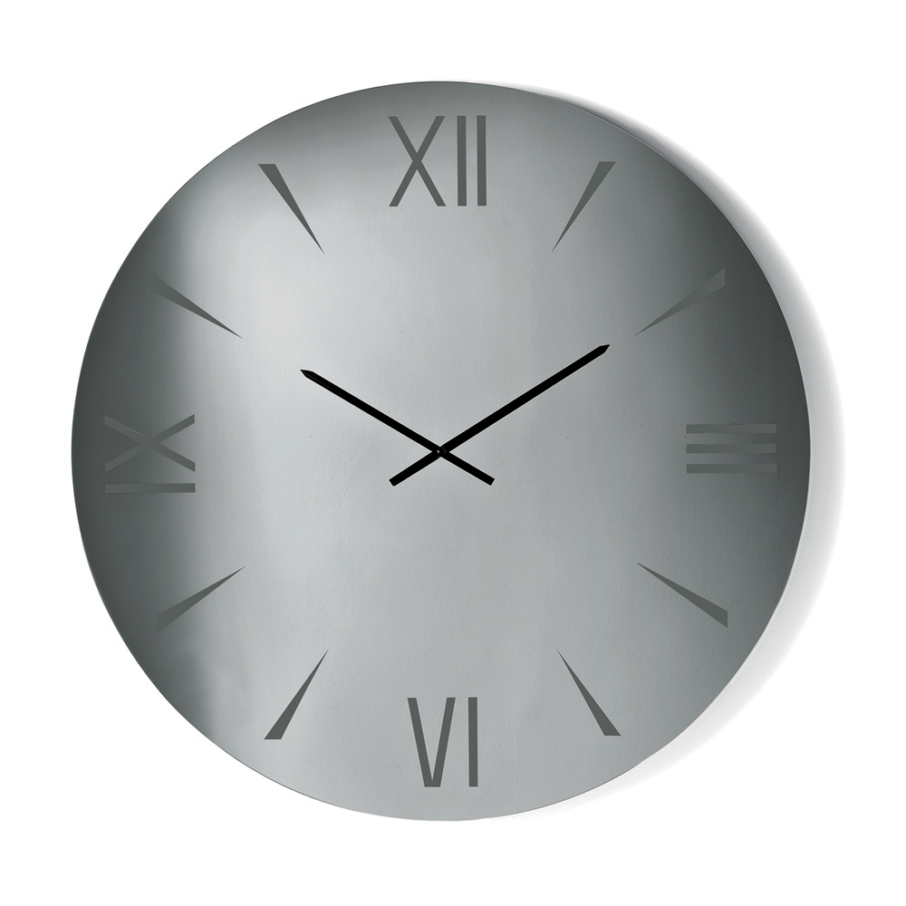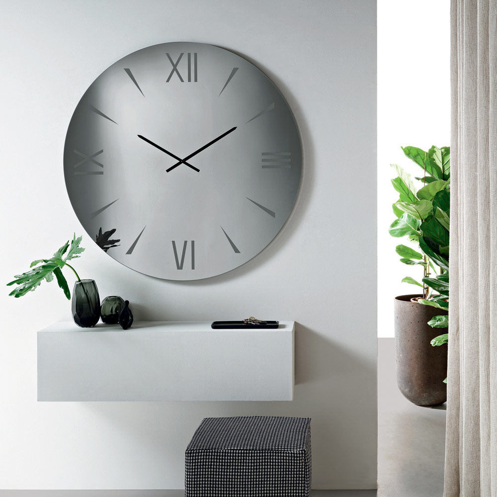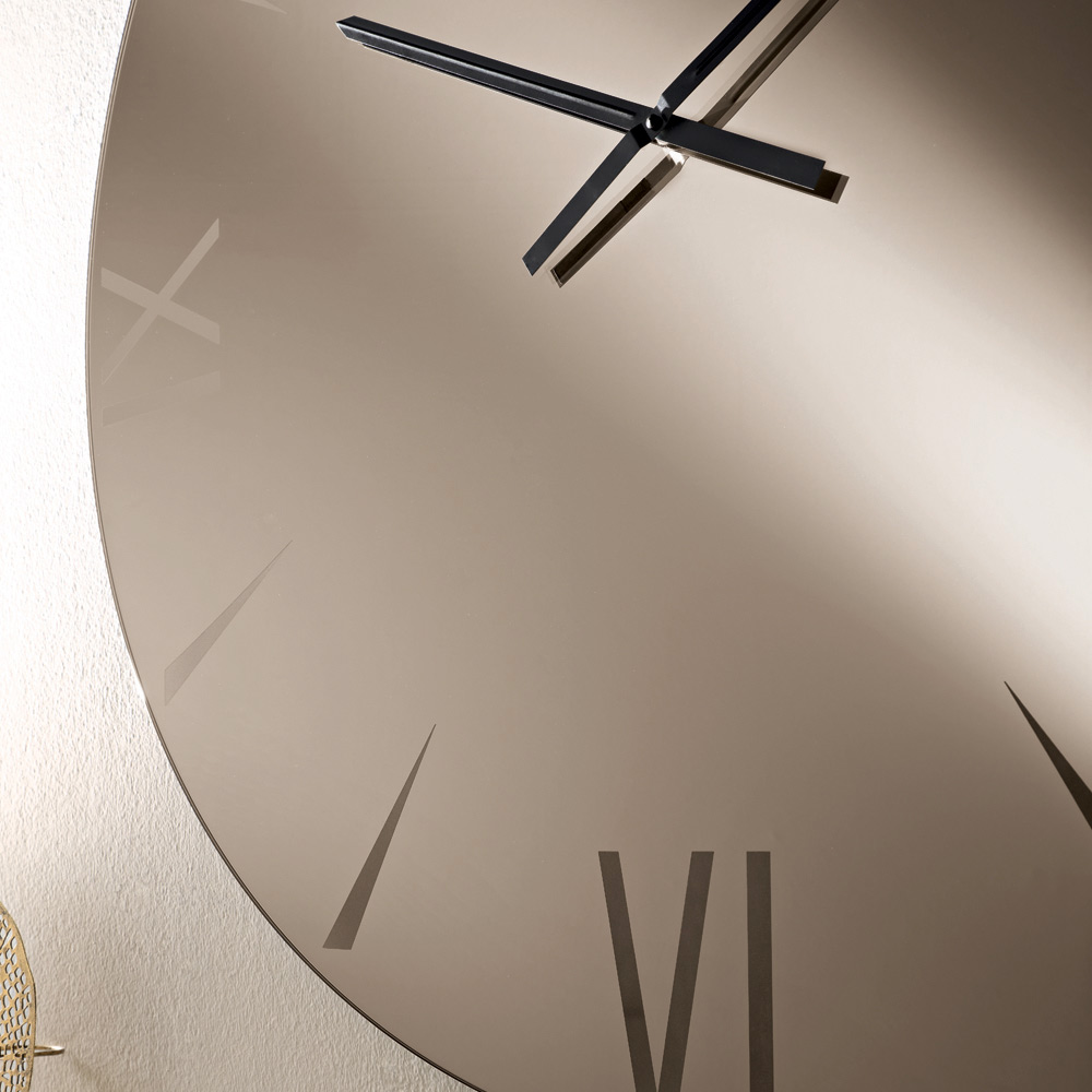 Crafted from mirrored glass , the clock stands out for its laser-engraved numbers , interpreted with graphic precision and visual discretion. The reflective surface captures the light and amplifies the space, creating a refined interplay of depth and reflections.
