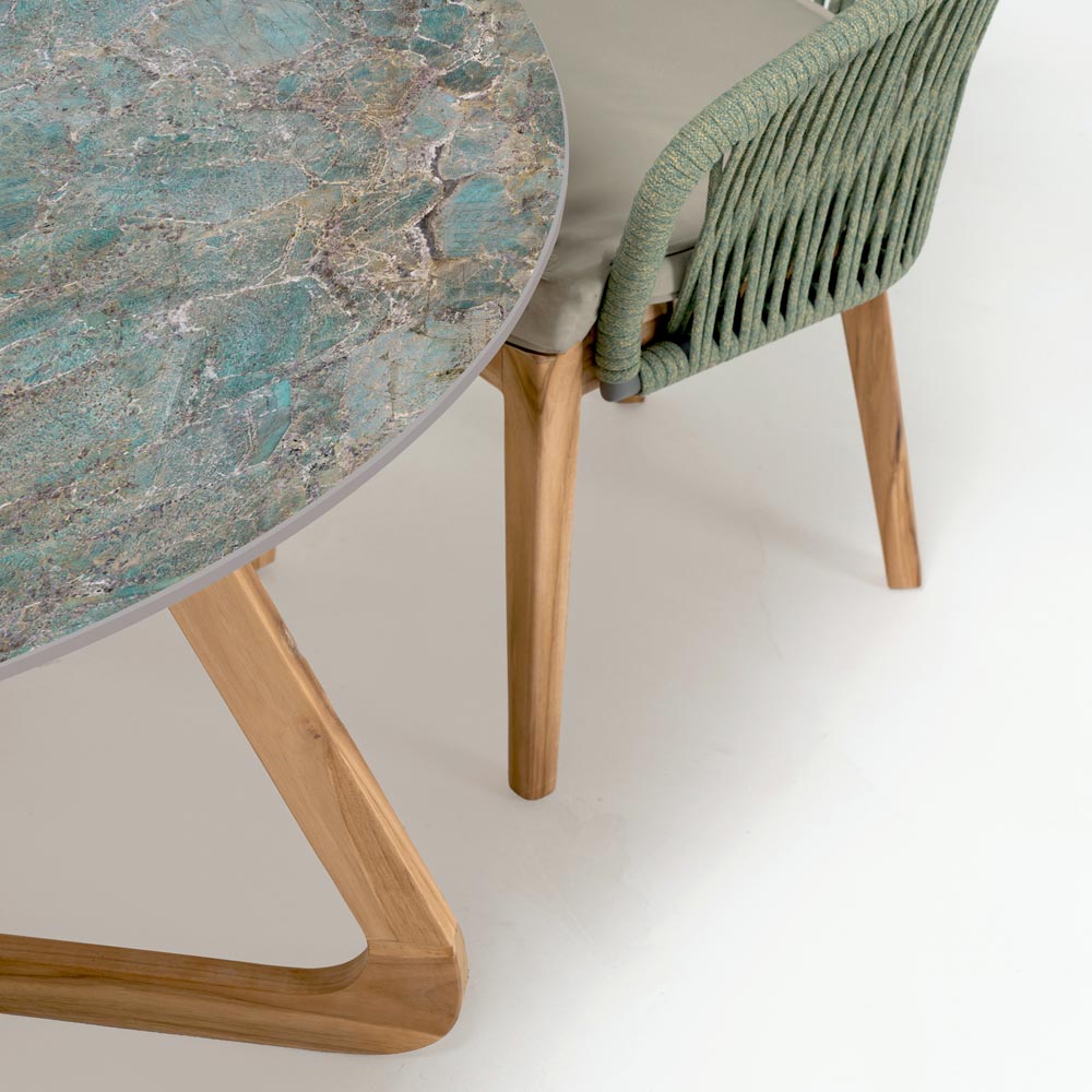 Made in Italy. This outdoor table is a designer piece that will transform your outdoor space into a stylish oasis. It features a ceramic top that reproduces the unmistakable beauty of Santos stone, with its captivating shades of green and touches of copper and blue, evoking the depths of an exotic seascape.