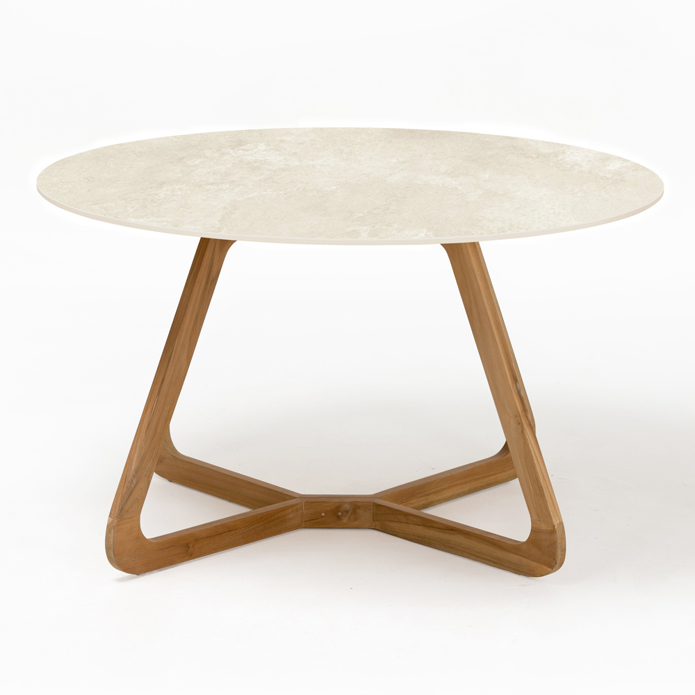 Made in Italy. This outdoor table is a designer piece that brings a touch of understated, natural elegance to your outdoor space. It combines a wooden base with a ceramic top that mimics Chianca di Ostuni stone, renowned for its neutral colour and delicate texture, adding a look both rustic and refined.