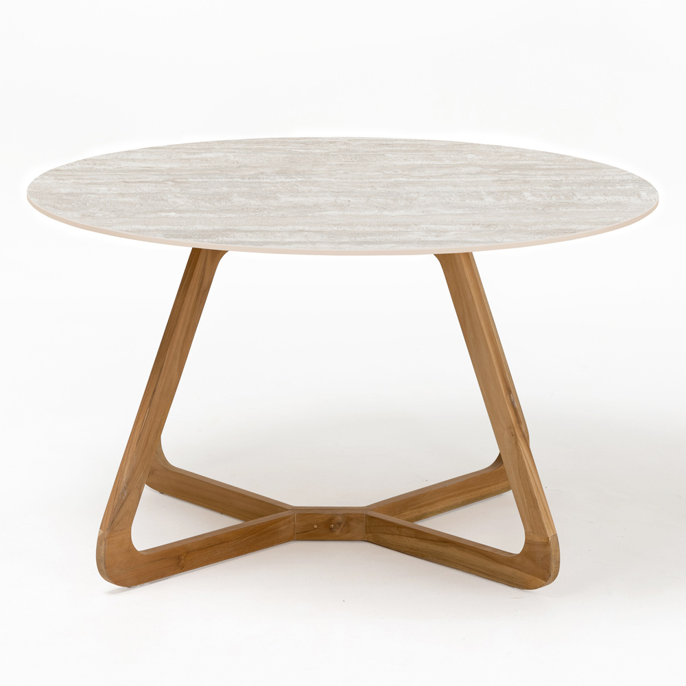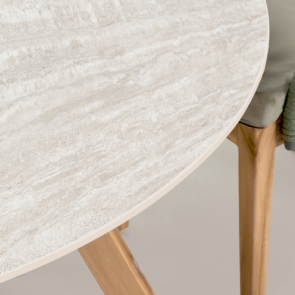 Made in Italy. This outdoor table is an impeccable choice for those who appreciate the beauty of timeless natural finishes. It combines a ceramic top inspired by Light Travertine with a wooden base, creating an outdoor furniture piece that is as functional as it is aesthetically appealing.