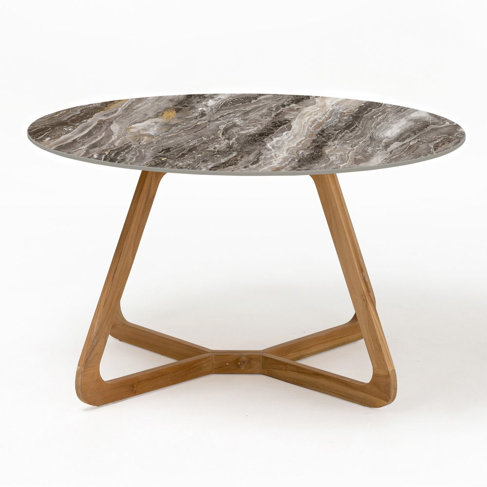 The wooden base adds a touch of warmth and a natural feel, contrasting beautifully with the rich grain and complex textures of the ceramic top. This combination is not only aesthetically appealing, but also offers structural strength that ensures durability and resistance to outdoor elements.