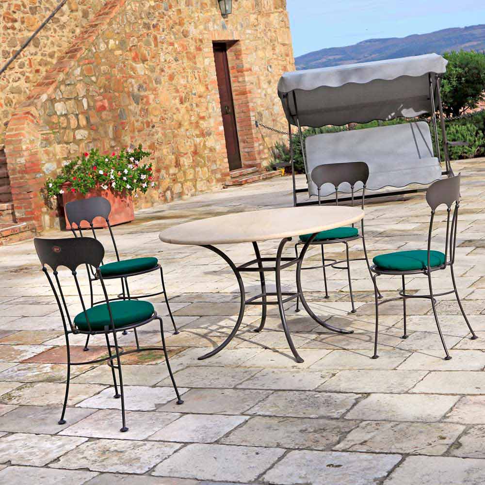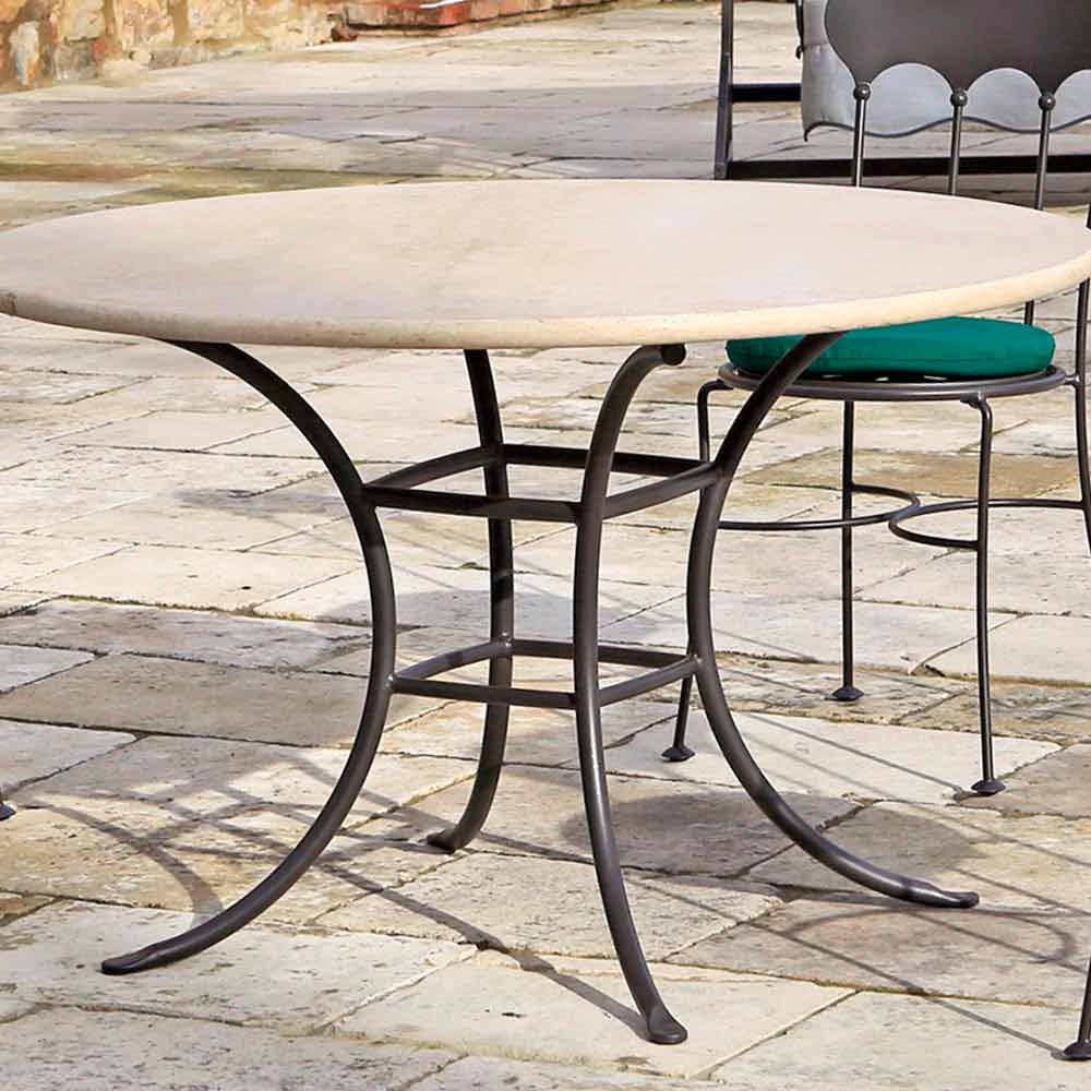 Outdoor dining table made in Italy with anthracite finish painted iron base and round top in light travertine . A furnishing idea that recalls a more classic style thanks to the use of materials and finishes with an ancient soul. The structure offers the product optimal stability while the hot-dip galvanizing treatment makes it particularly resistant to any type of corrosion, guaranteeing the rustproofness of the metal for decades and enriching its aesthetics with a coating with a rough texture that enhances the ancient flavour of its forms. The 100% Italian craftsmanship together with the attention to detail underlines even more its value and value, thus offering a high quality final product capable of characterizing any outdoor space thanks to its strong classic personality and elegance without time of the travertine top which gives the table its old-fashioned aesthetics.