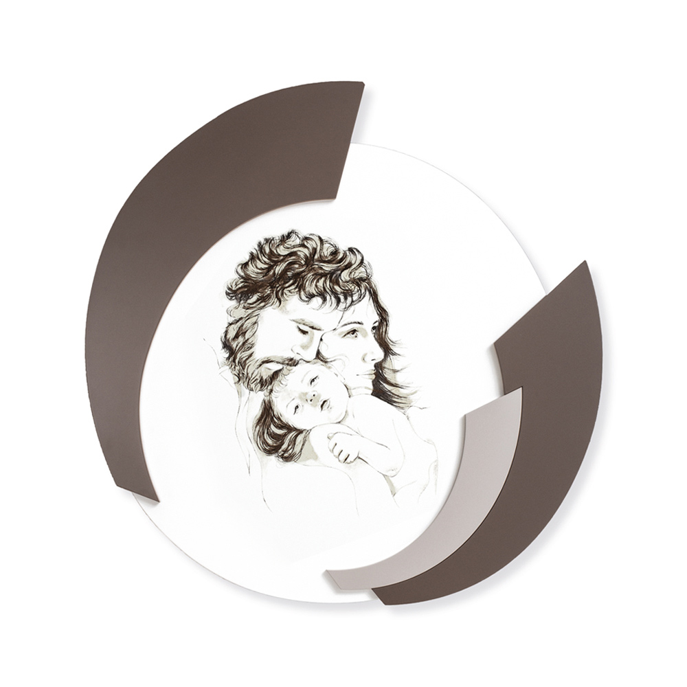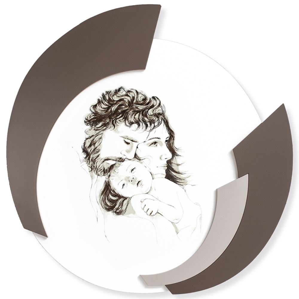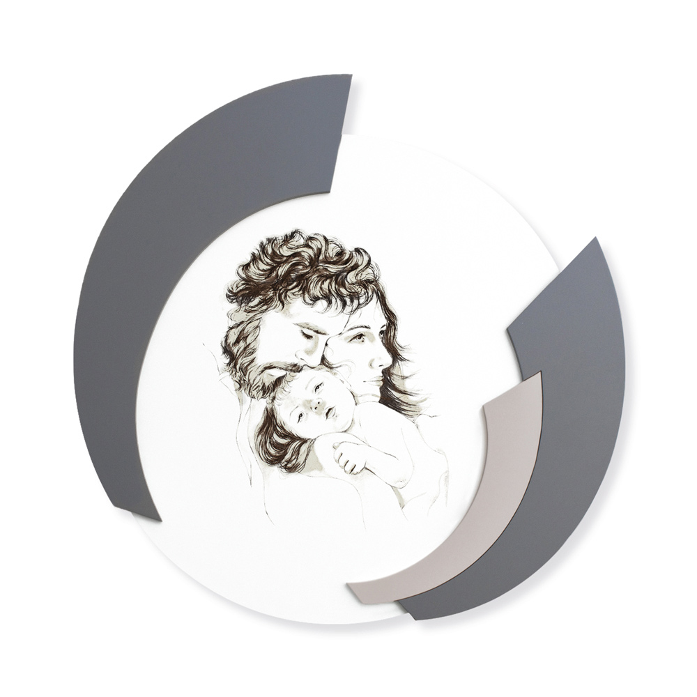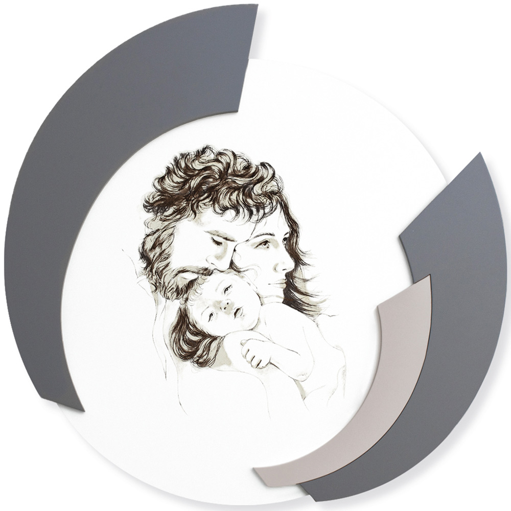 A round headboard that encloses the image of the Holy Family surrounded by wooden decorations lacquered in the colours of your choice . Matt white lacquered wooden panel with laser marking, a special technique that creates a bas-relief on the materials. The original handmade design combined with laser technology gives life to this work engraved on several levels.