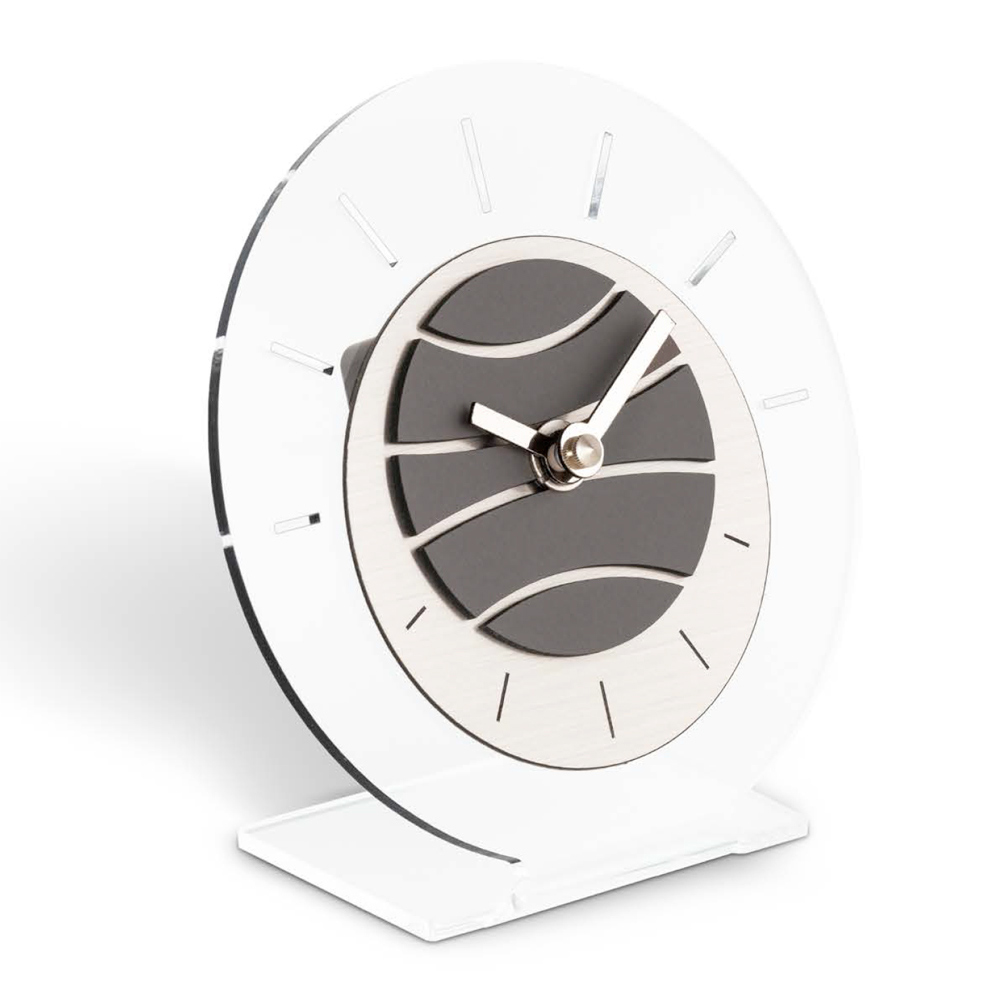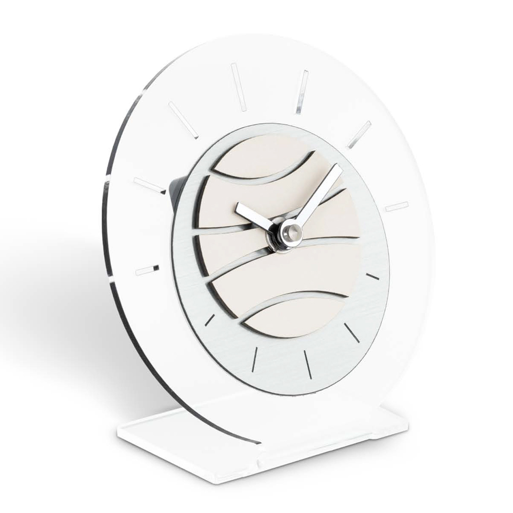 Table clock made of high density and purity transparent methacrylate , cutting of the base and dial obtained with high-tech tools, entirely Made in Italy.