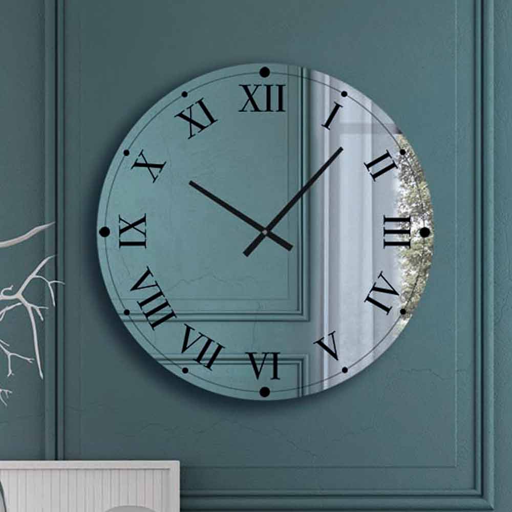 Round wall clock Made in Italy made of mirrored crystal glass with Roman numerals and black hands.