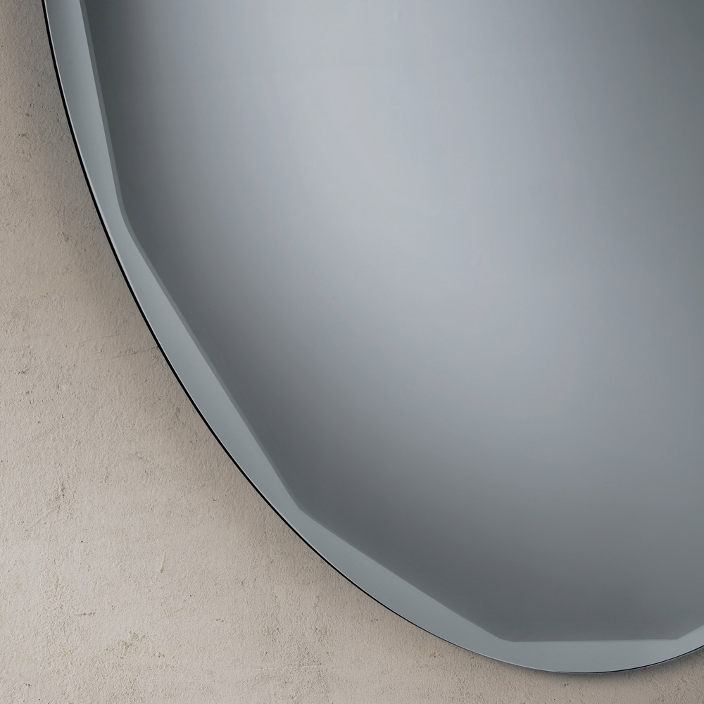The mirror features a pure round shape embellished with a refined lateral bevel that enhances its profile and enhances the minimalist design. This detail creates a delicate play of reflections along the edge, lending depth and luminosity to the surface.