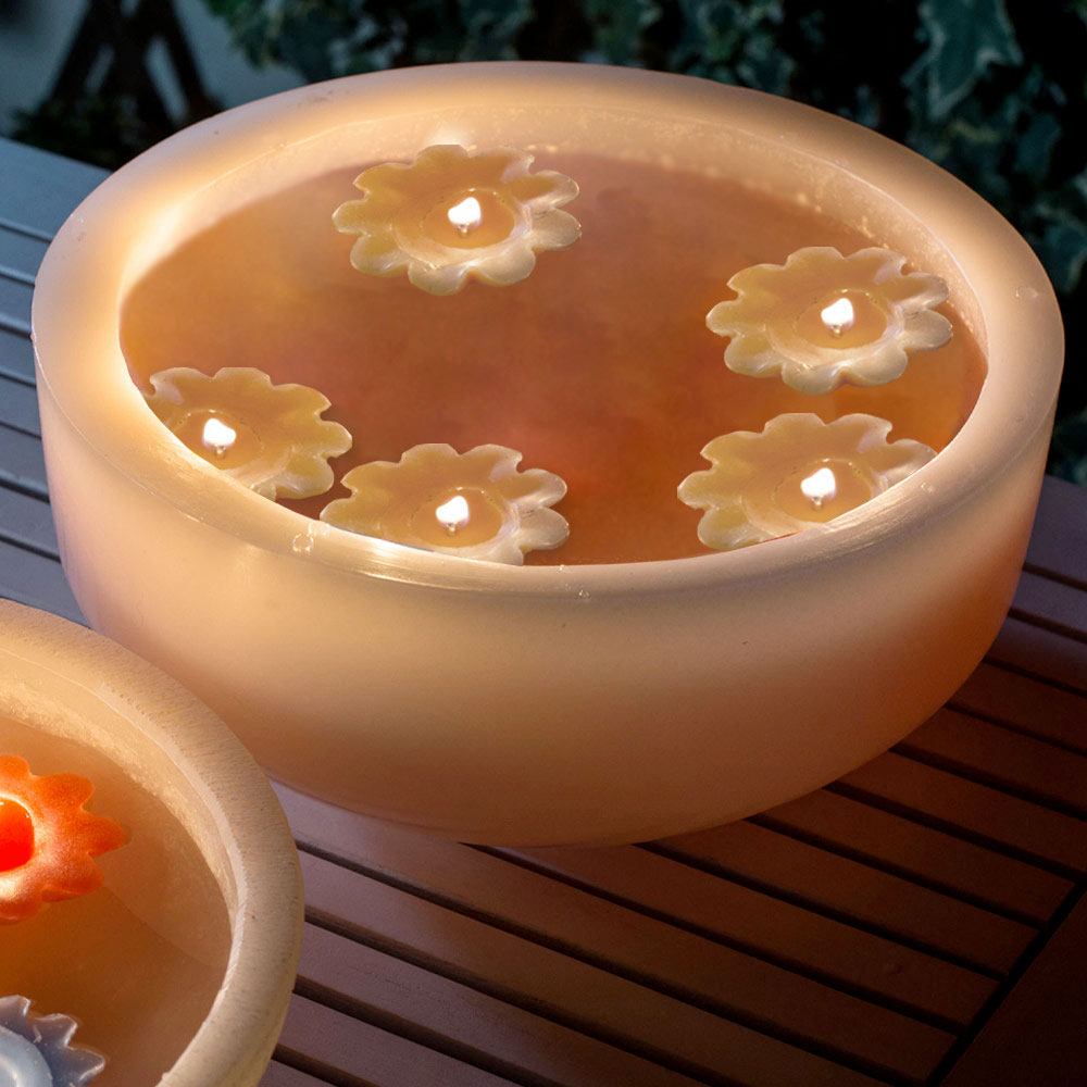 Utina is a round bathtub made entirely of light ivory wax including 8 floating flower candles available in ivory or in the colored variant, thus allowing you to illuminate evenings with chinas in a fun and elegant way at the same time. This lantern is designed and manufactured by professional Italian artisans in the sector since 1905 who use only carefully selected and certified raw materials to ensure a high quality and entirely Made in Italy final product .