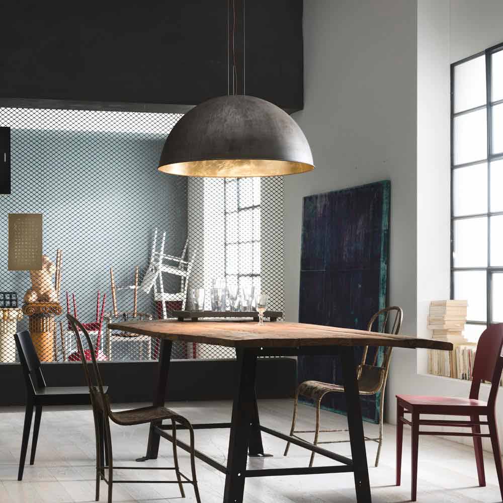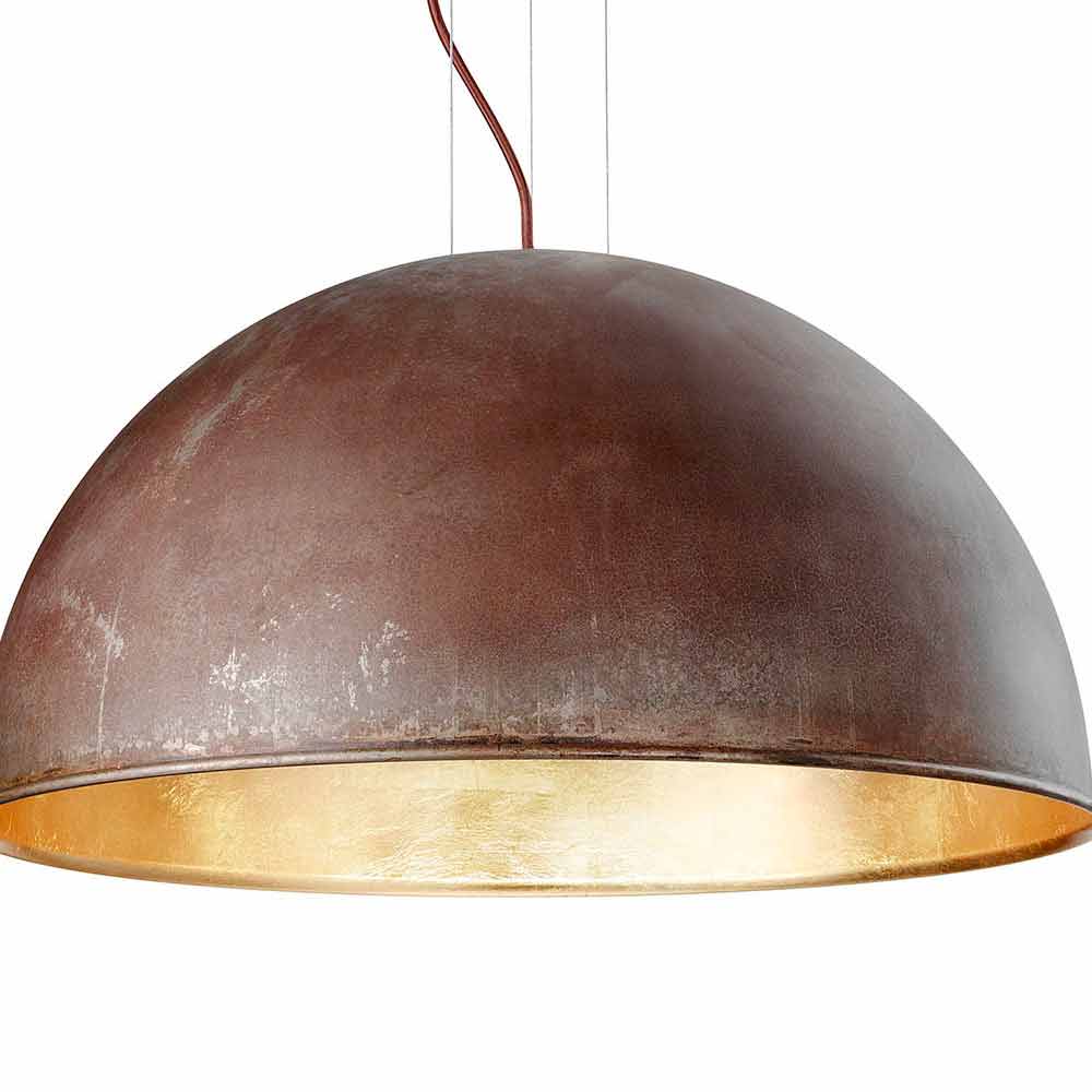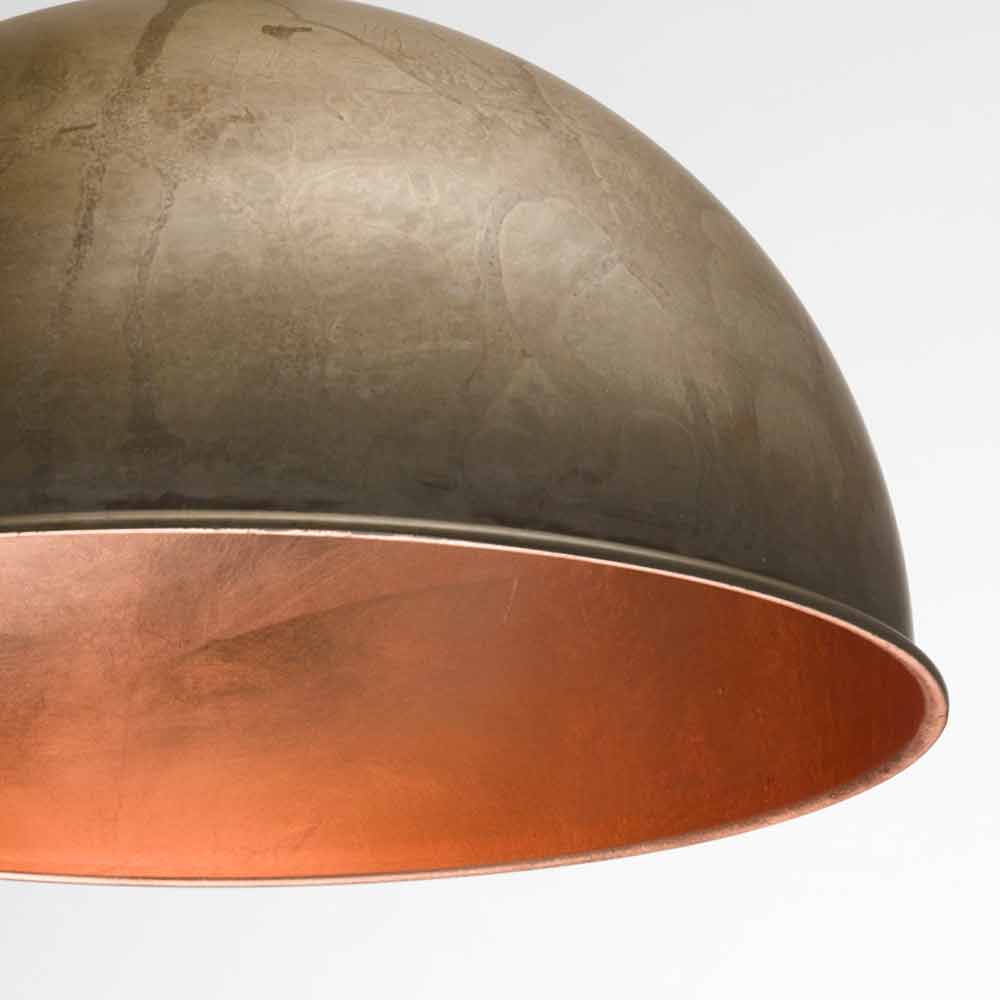 The firm graphic queue and the perfect half sphere characterise this collection of lamps, designed as a tribute to the astronomical revolution. The contrast between the outer look made of brass or iron and the interior one done with gold, silver or copper foil, ascribes this product an aesthetic value of great visual effect. Available in brass or iron exterior for diameters 30, 40, 60 cm and in iron exterior for diameter 80 cm.