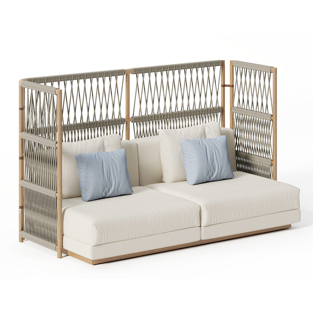 cushion upholstered in fabric and structure in iroko wood and green rope weaving . The product consists of a