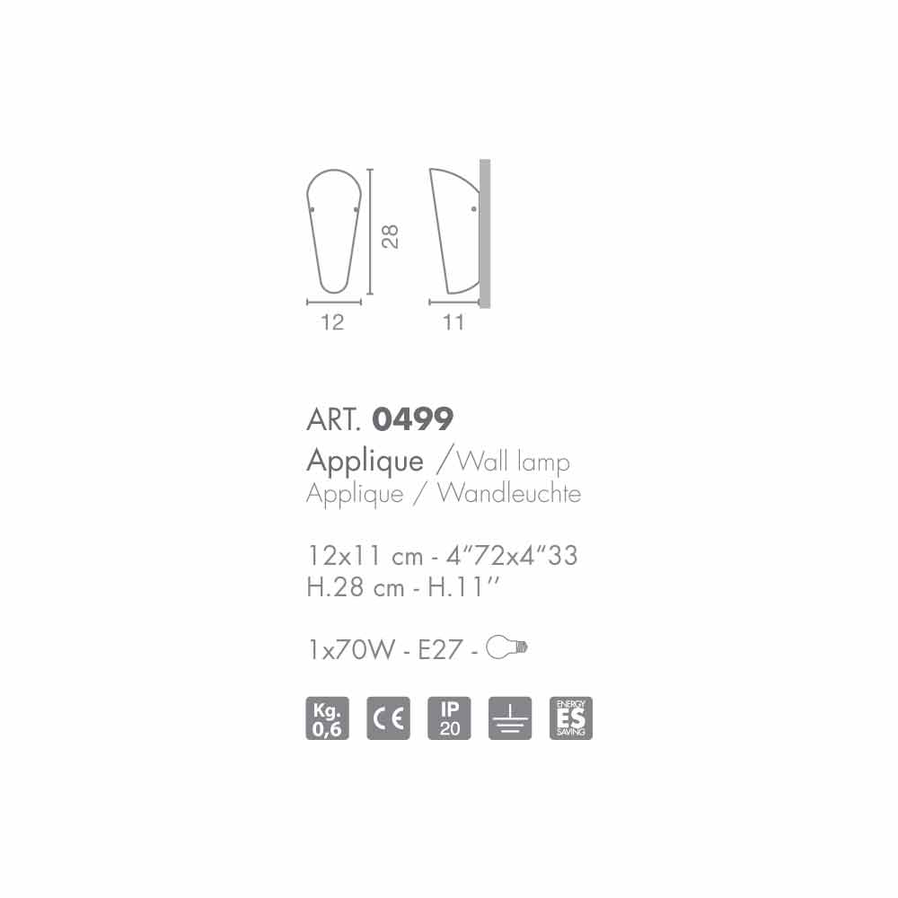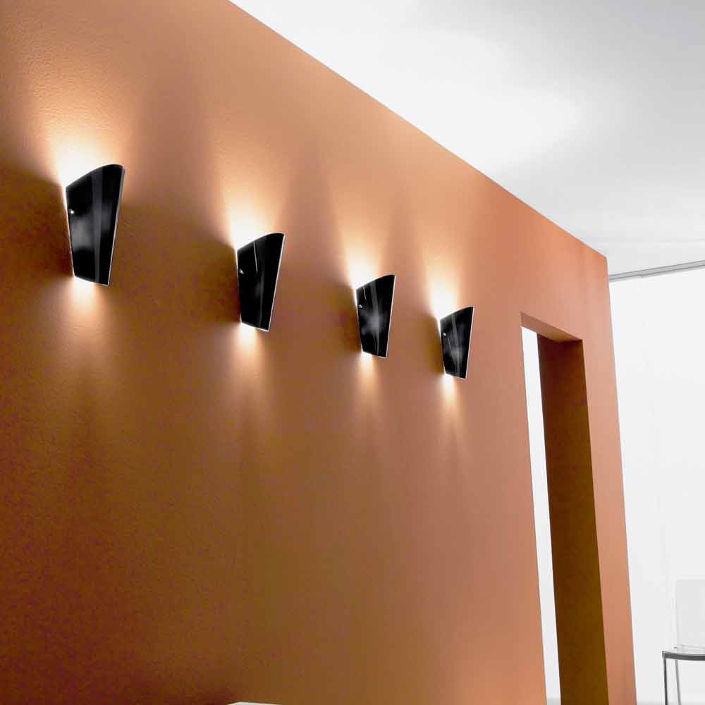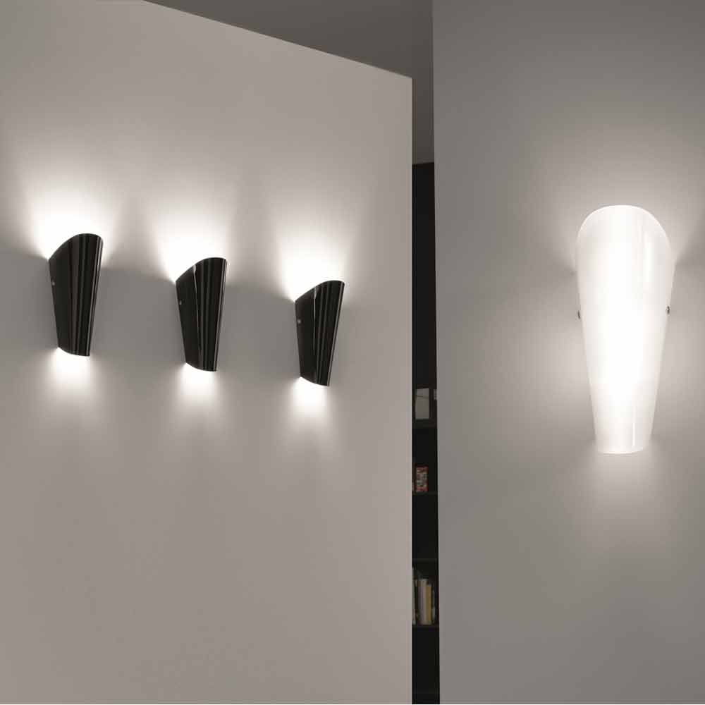 Versatile glass wall lamp with limited overall dimensions and countless variations of colour, available also with gold or silver decoration.