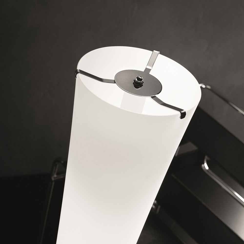 Available in various colours such as amber-black, bronze decor, multicoloured with murrine, and white, it is always dimmable and illuminated by two T5 or with strip led.