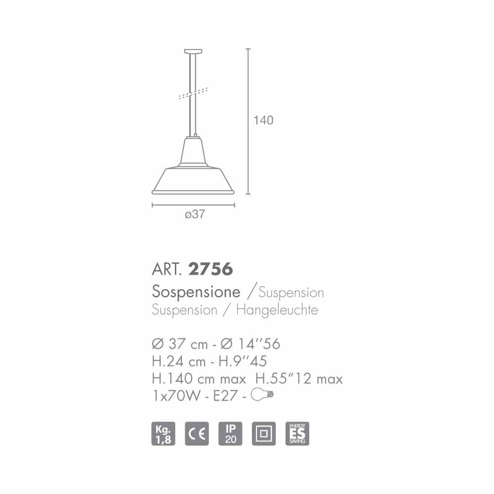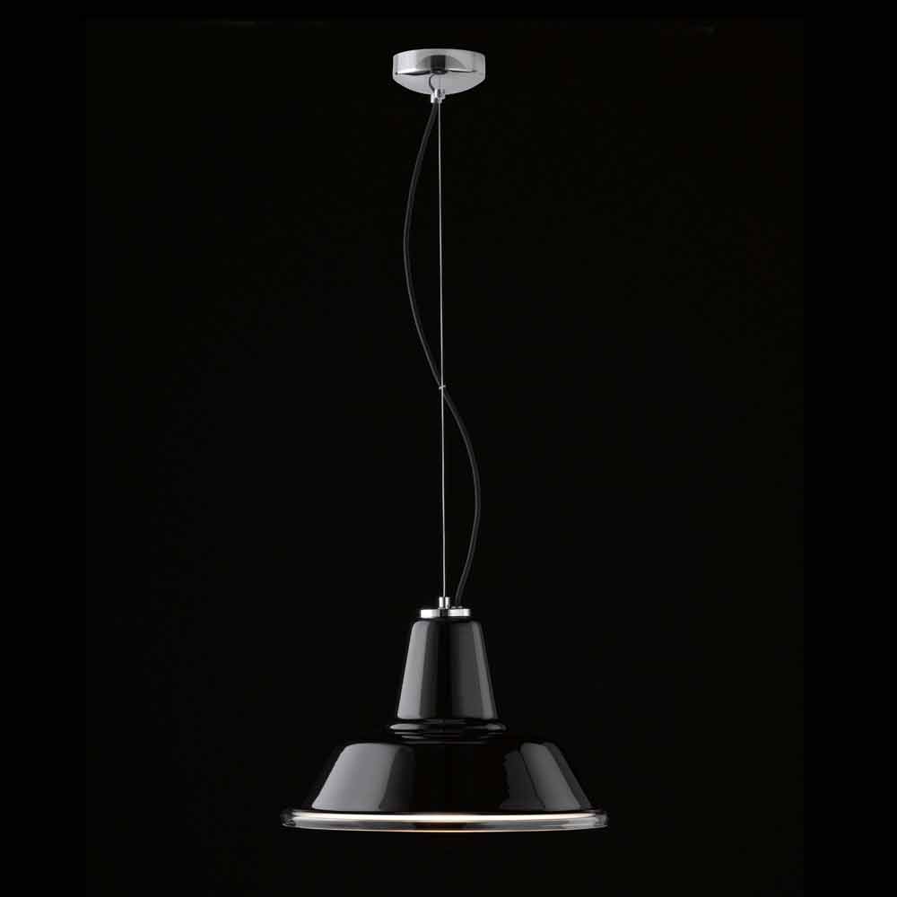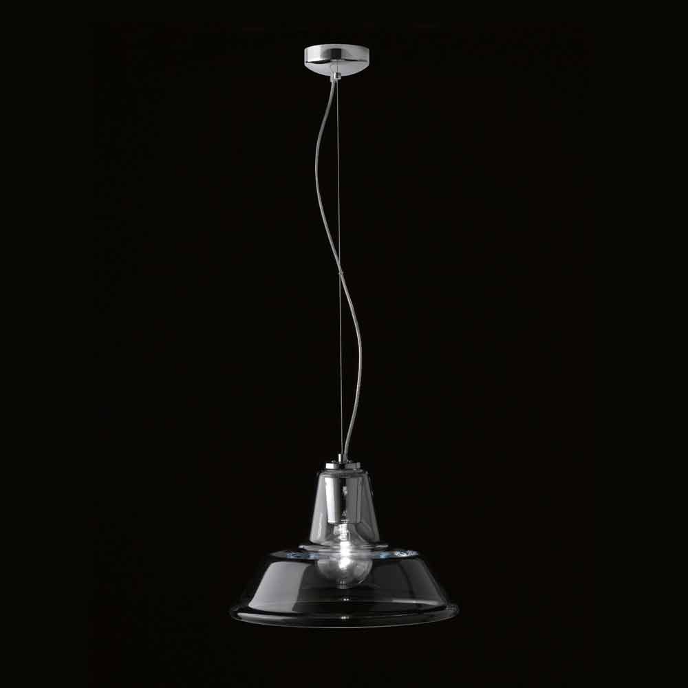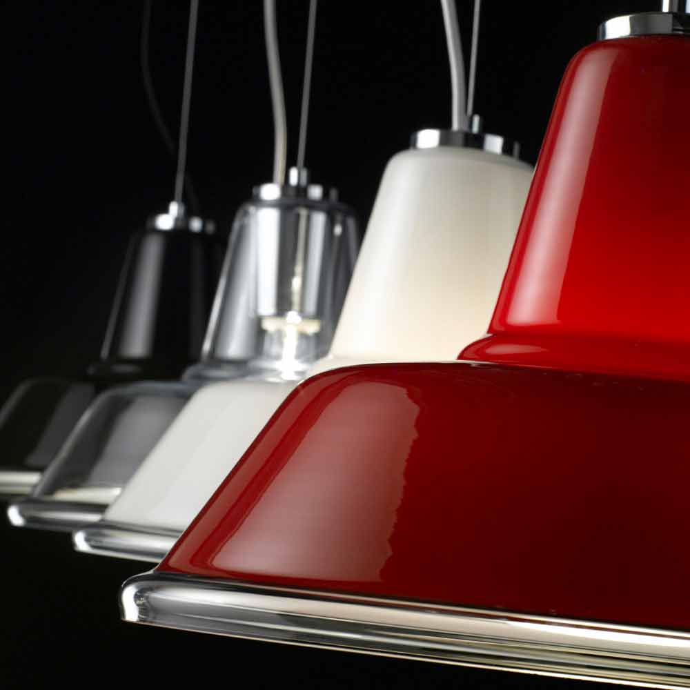 Pendant lamp with a recognisable industrial design but created by a special blown glass diffuser. The finishes available are: transparent, white, black or red, with chrome or copper frame.