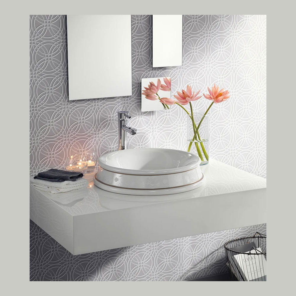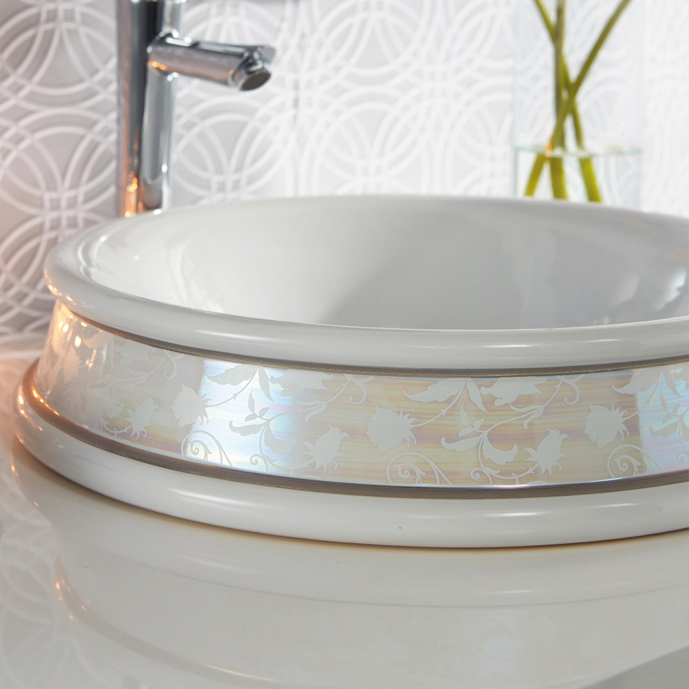 Semi-recessed bathroom sink made of fire clay with ton sur ton embroidered lace , entirely Made in Italy.