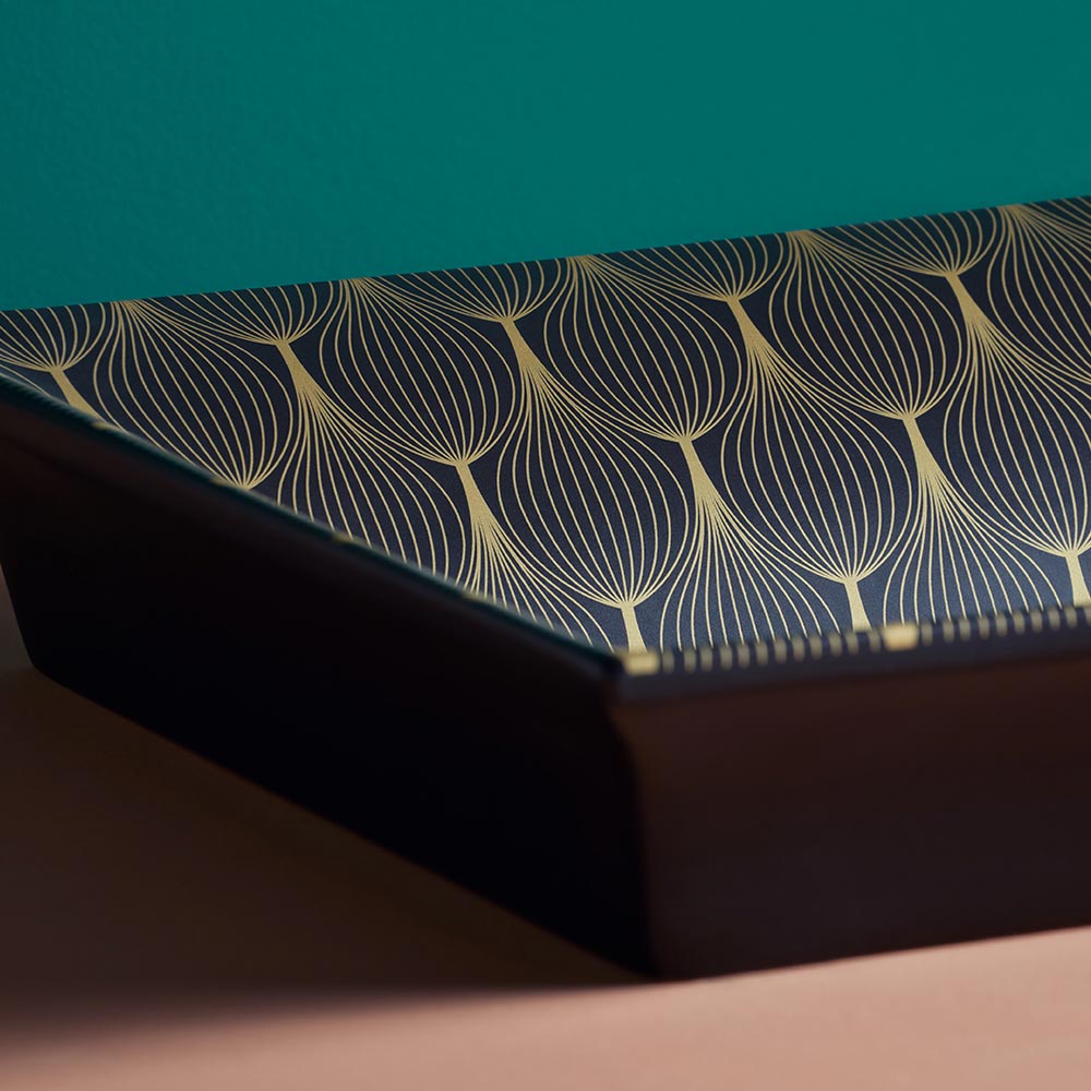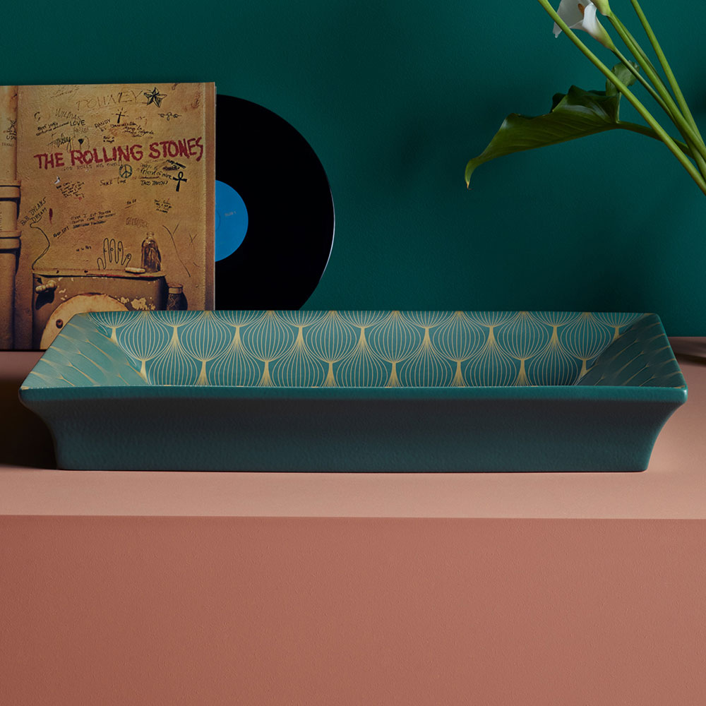 • interior texture in matt emerald and gold, exterior in matt emerald enamel