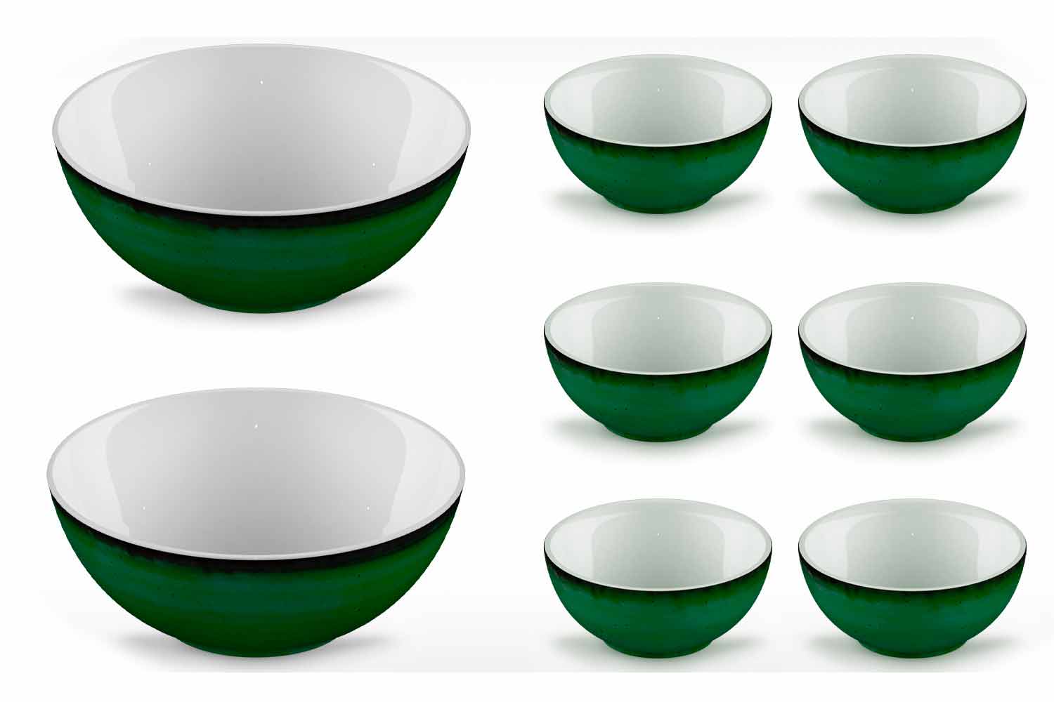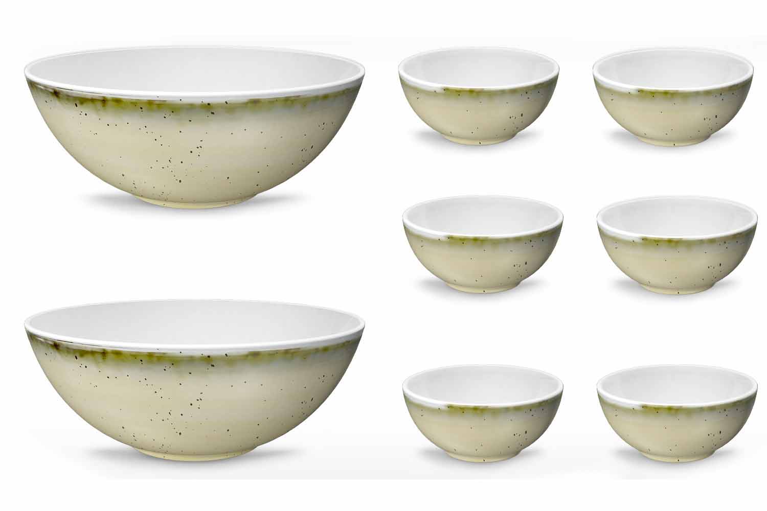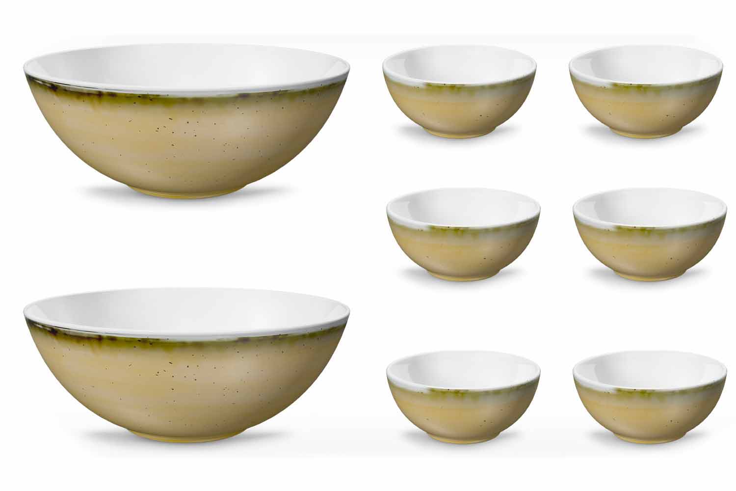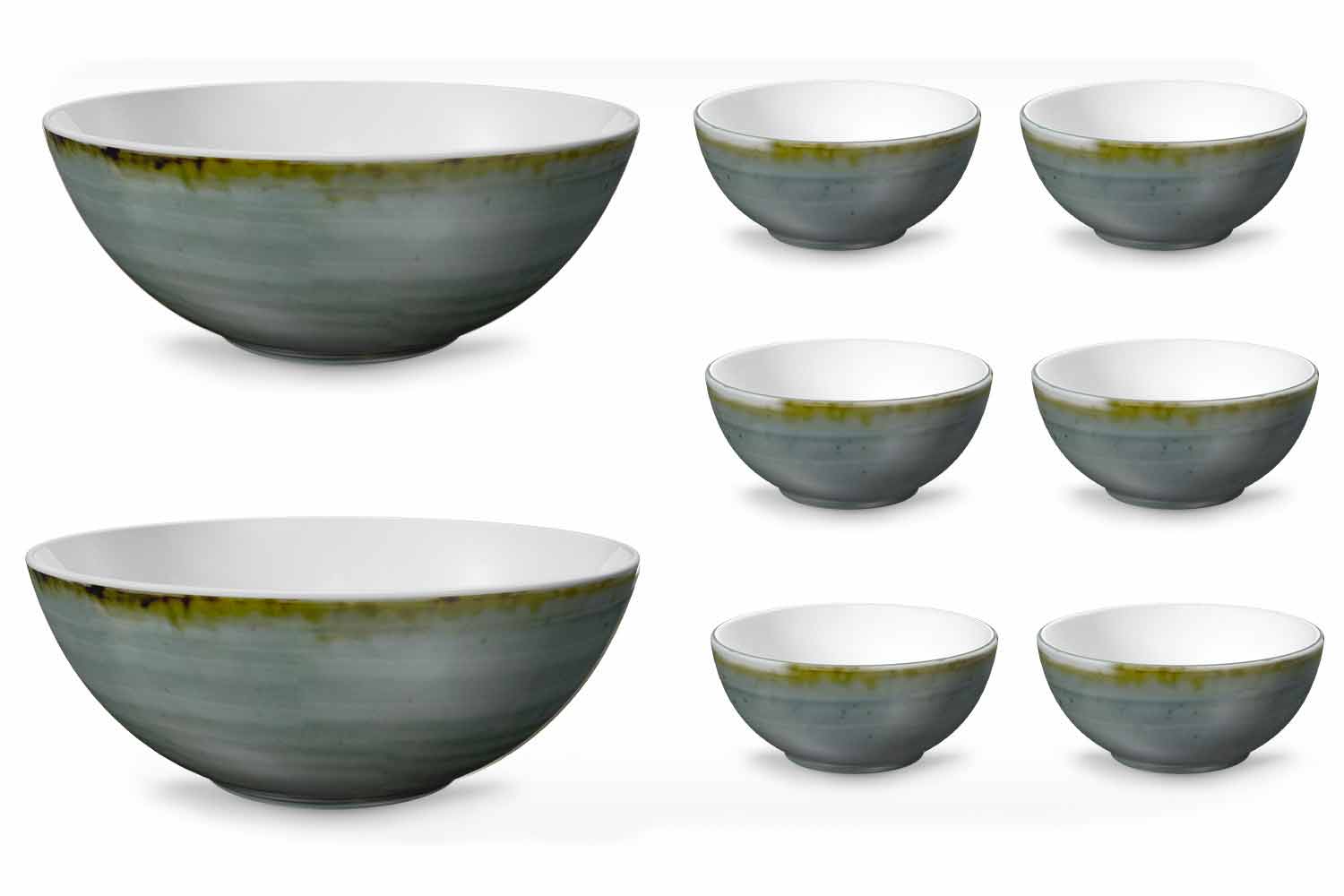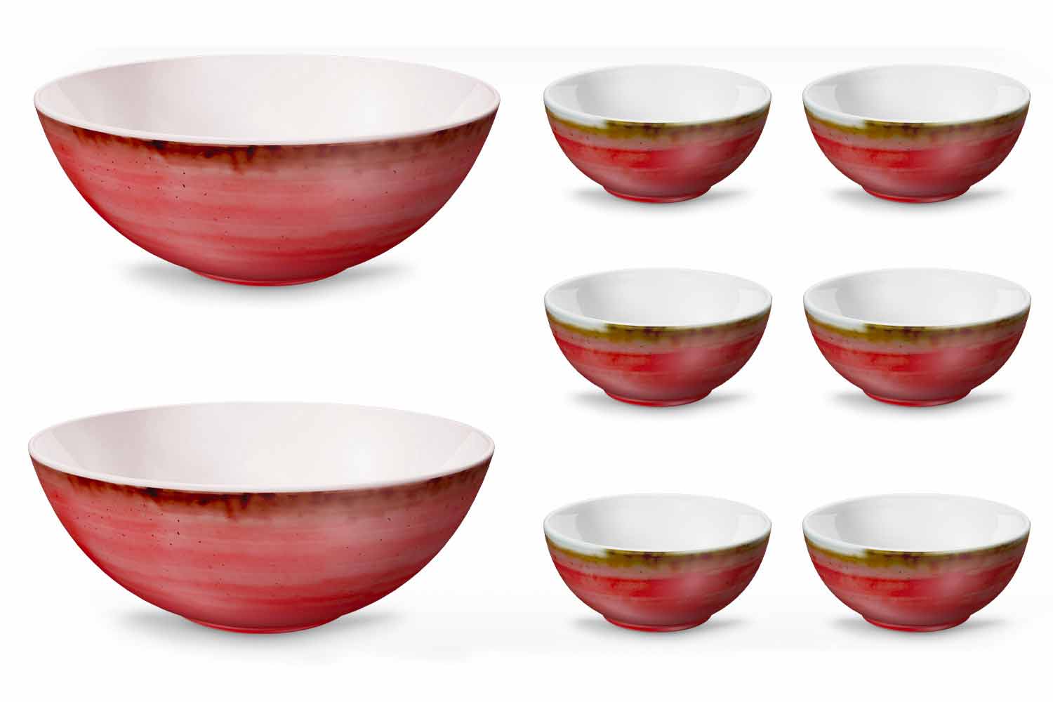 Rustic modern design ice cream or fruit salad bowl set in colored porcelain, 8 pieces.