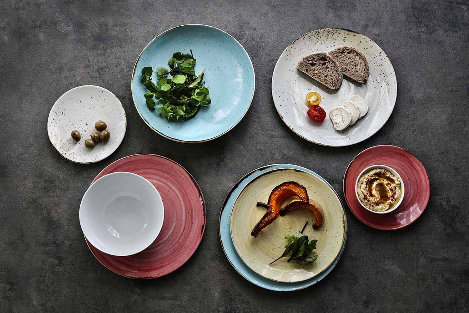 dinner plate set is presented as simple, elegant and refined, made of calcomania in different colours, for a rustic and versatile style.