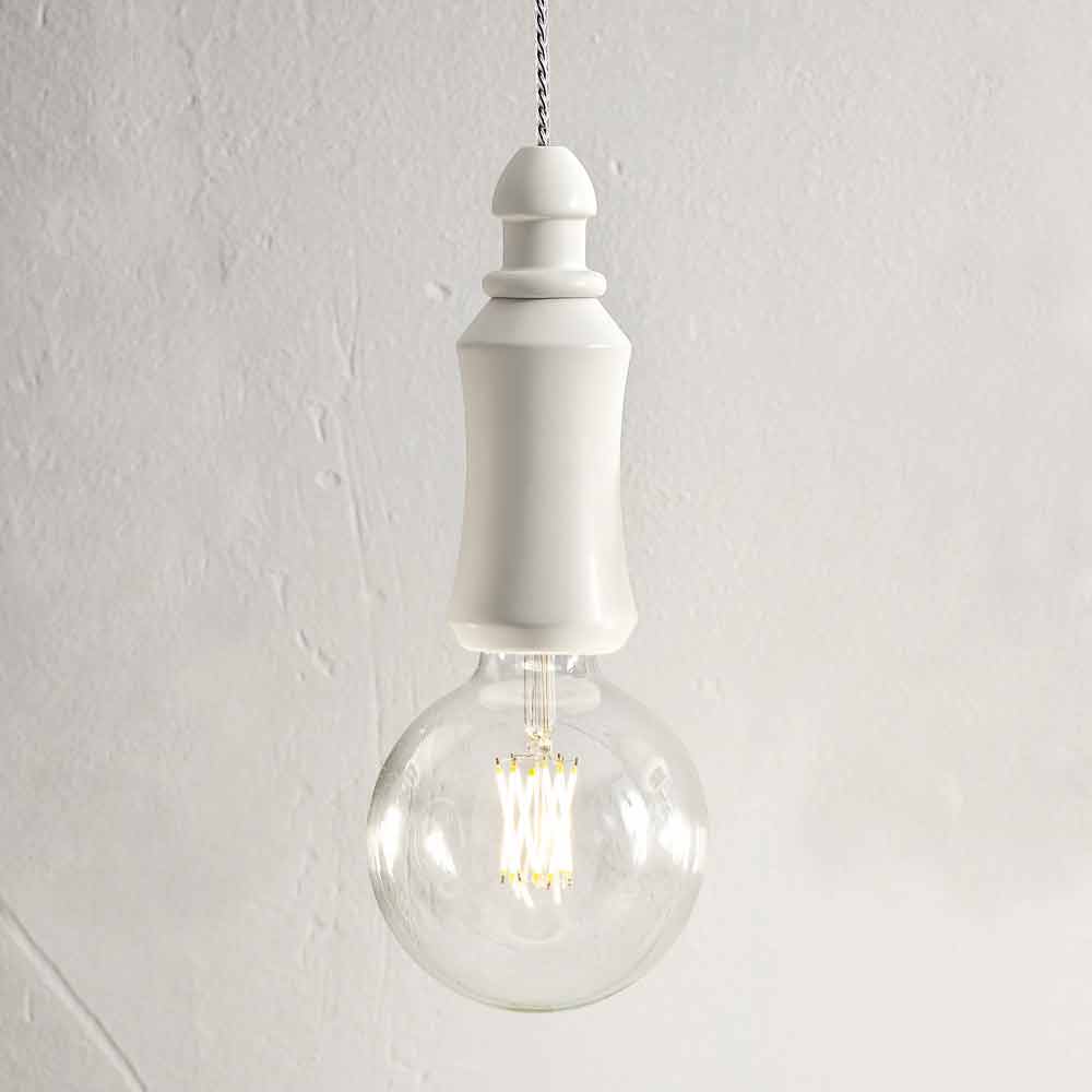 The electric cable is made of steel and is covered with a transparent silicone sheath. The lamp is supplied without a light bulb, but is well suited to decorative light bulbs on the market.