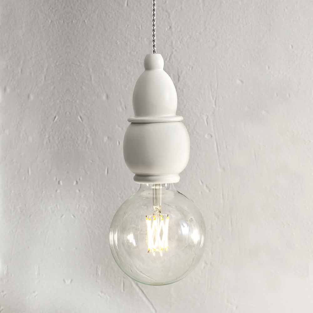 Both finishing are available in glossy or matt versions. It has an electrified steel cable covered with a transparent silicone sheath. The lamp is supplied without a light bulb, but is well suited to decorative light bulbs on the market.