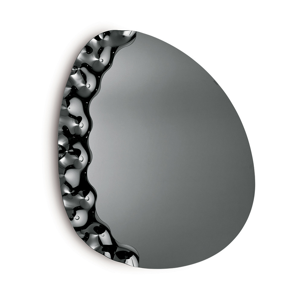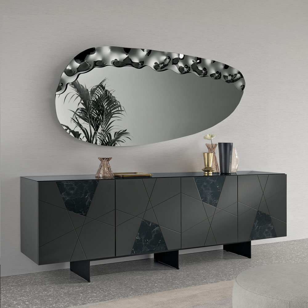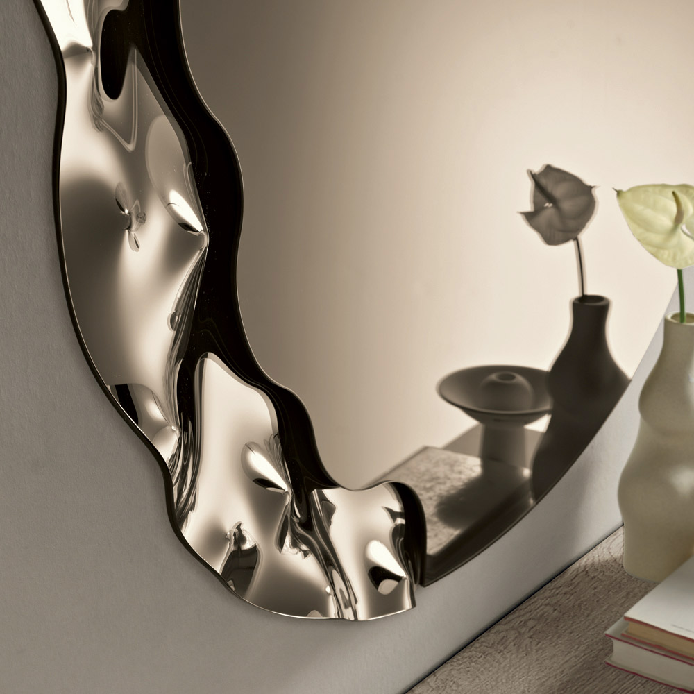 An elegant wall mirror designed in Italy , ideal for enhancing spaces such as the entrance , living room , or bedroom . Its contemporary design combines soft lines and textured details, transforming the mirror into a refined decorative element capable of elegantly enhancing the wall.