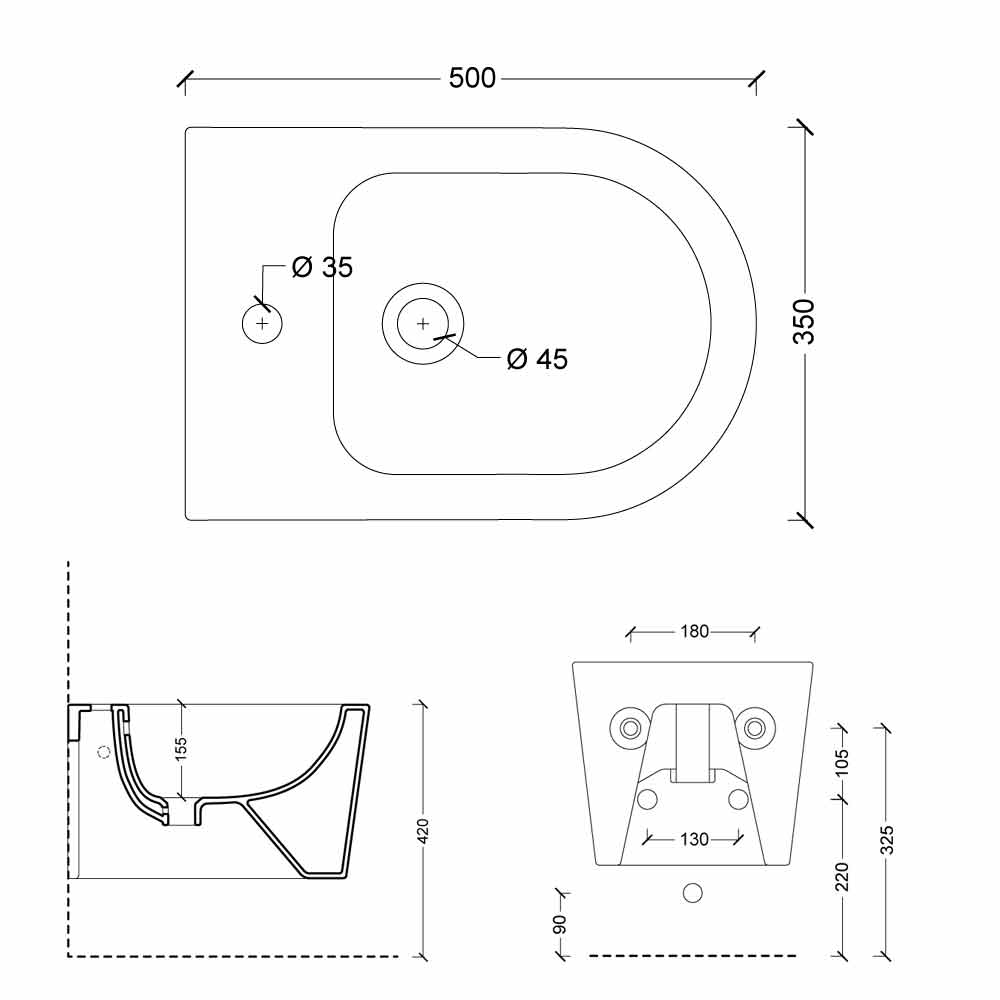Modern ceramic wall hung bidet Shine Square 50x35cm, made in Italy
