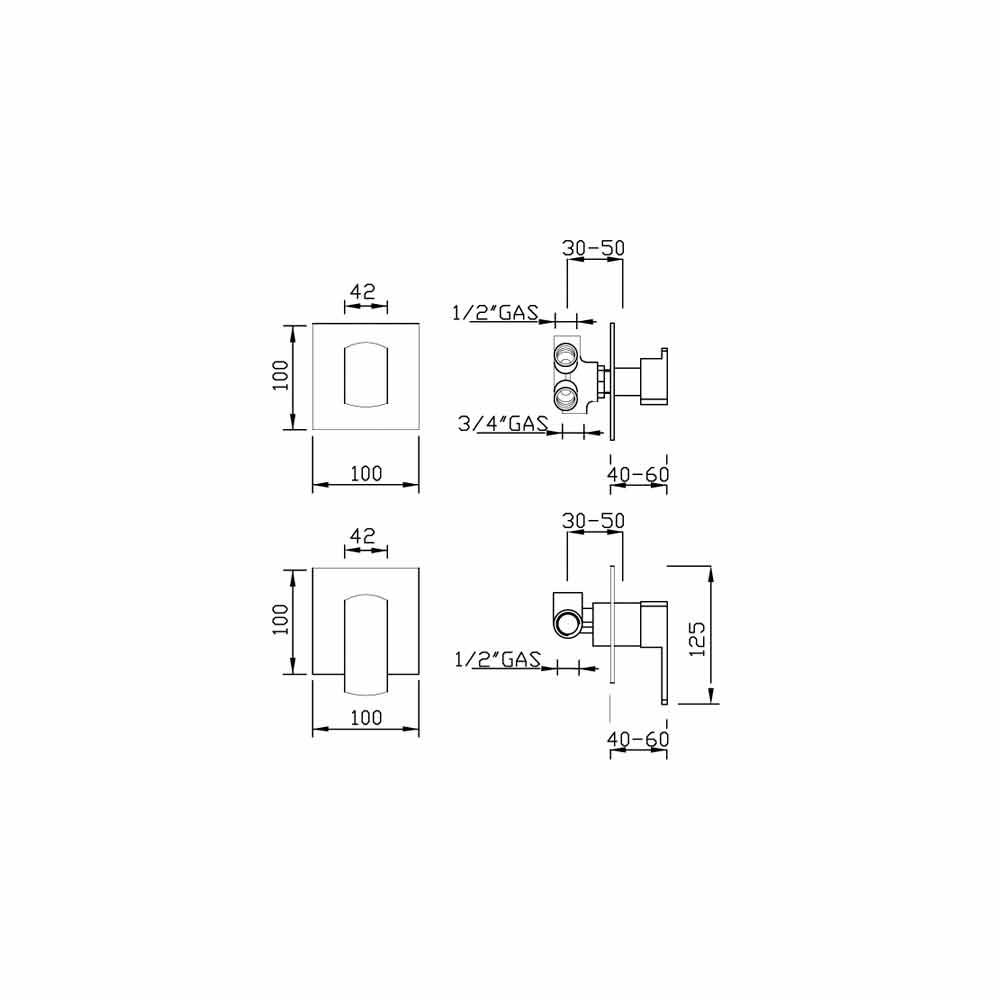 Built-in shower mixer with 5-way diverter complete with built-in part and external parts.