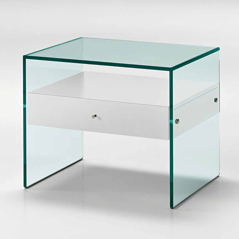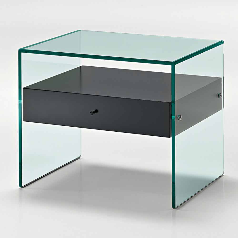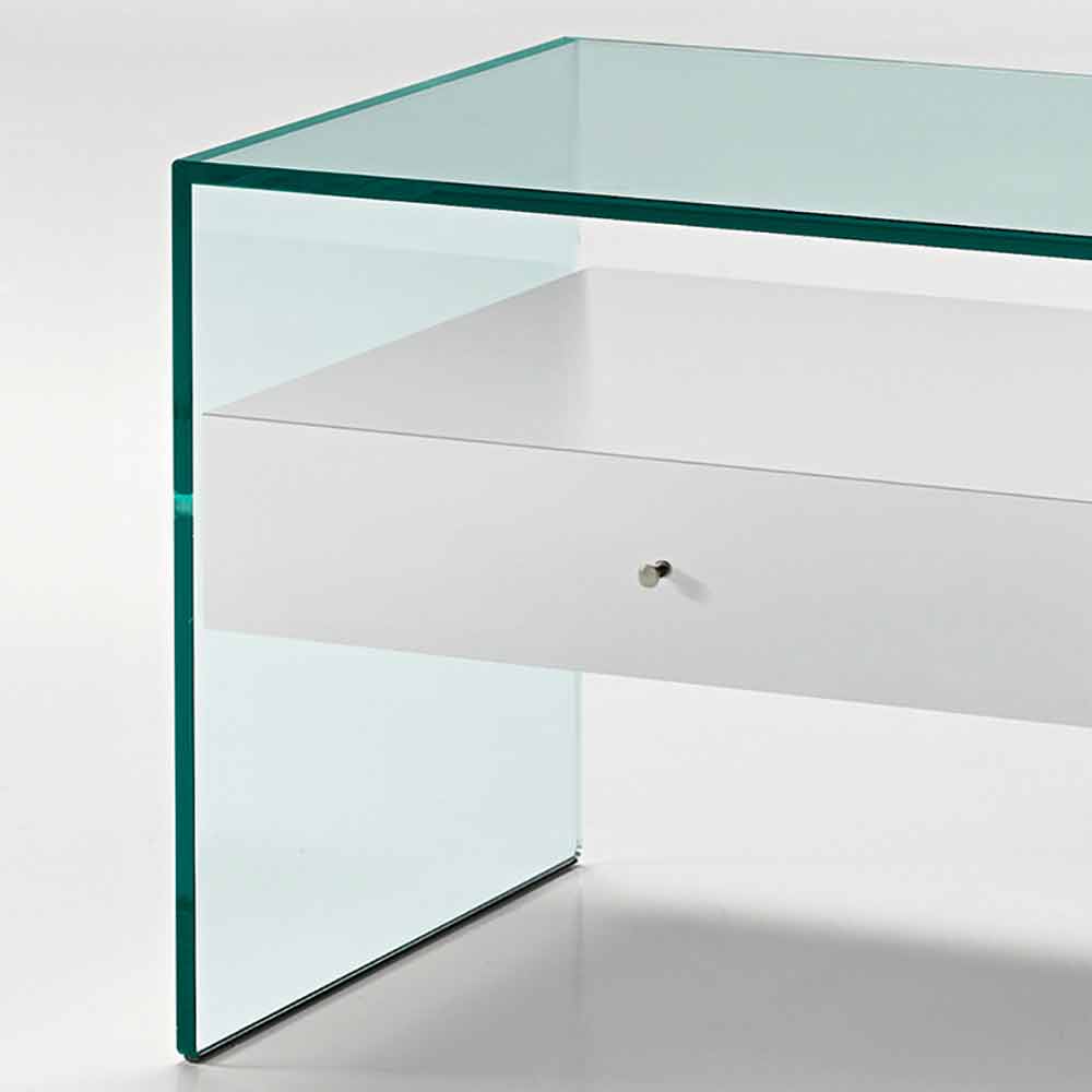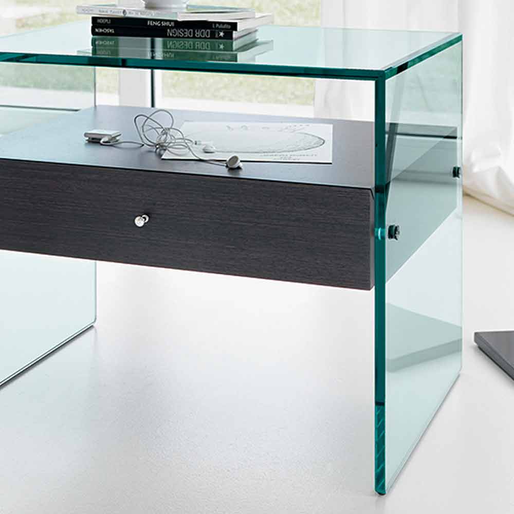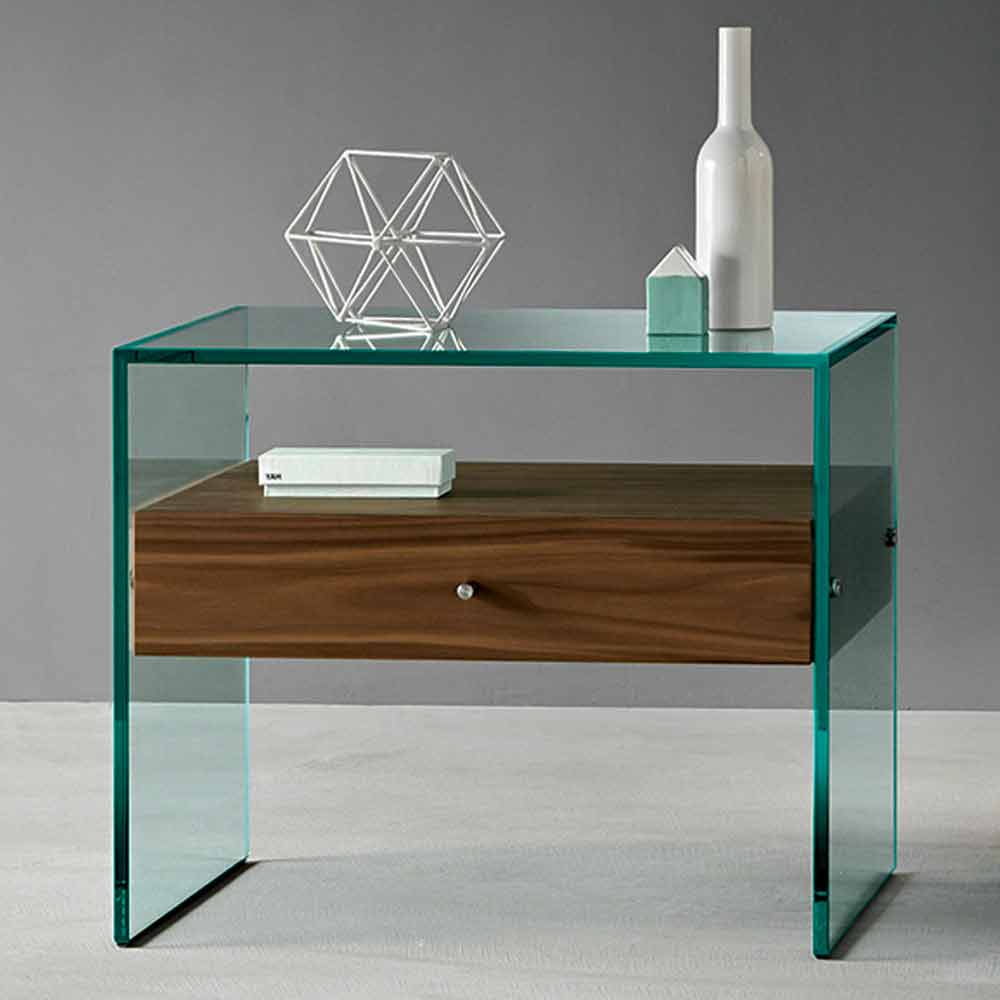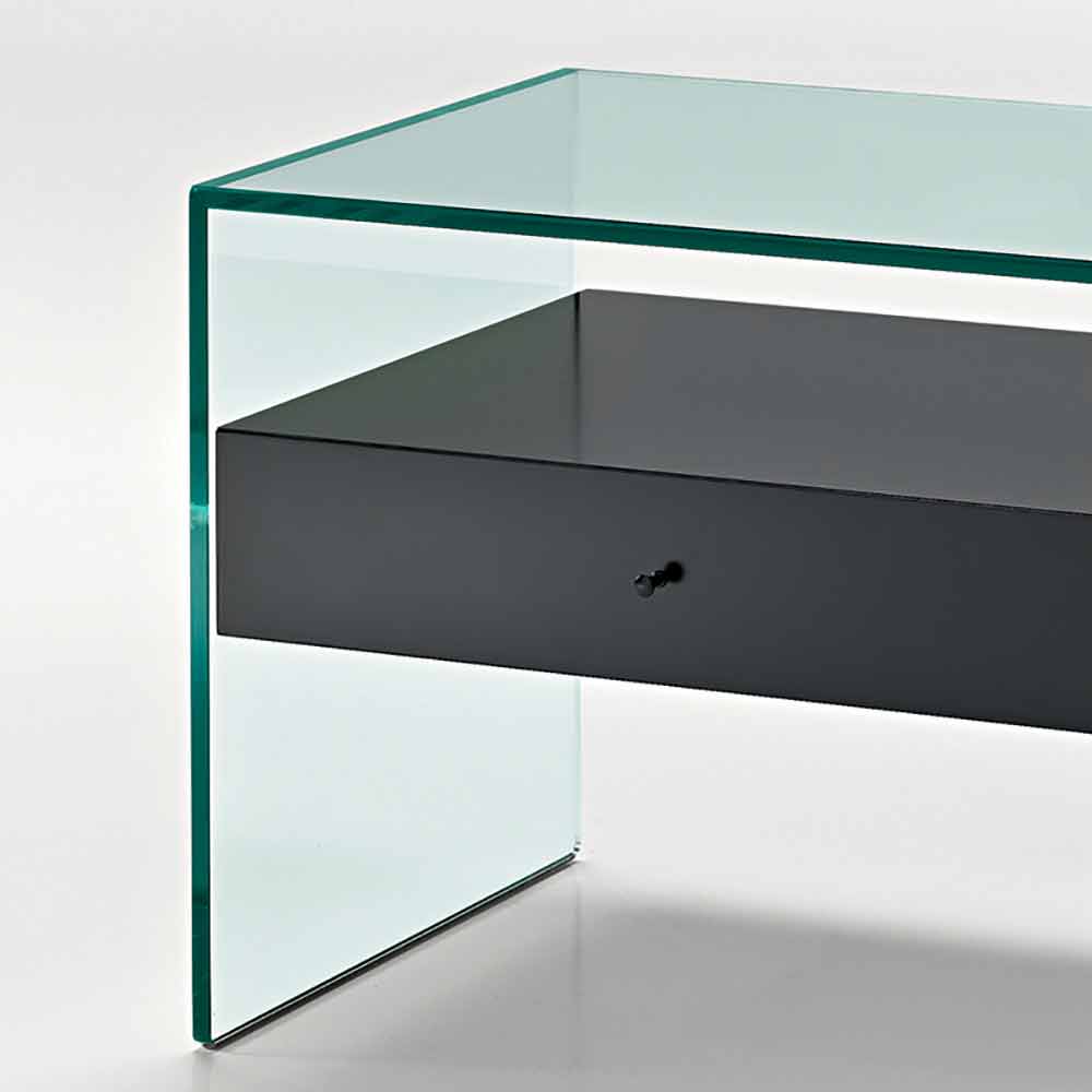 Modern design side table in extraclear glass with wood drawer, realized in Italy by hand.