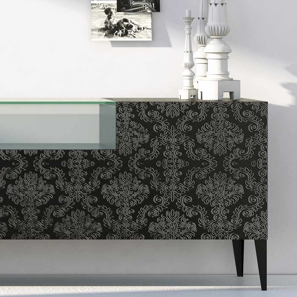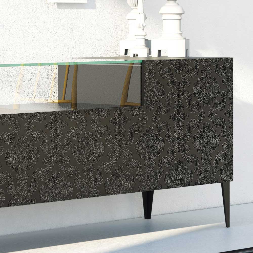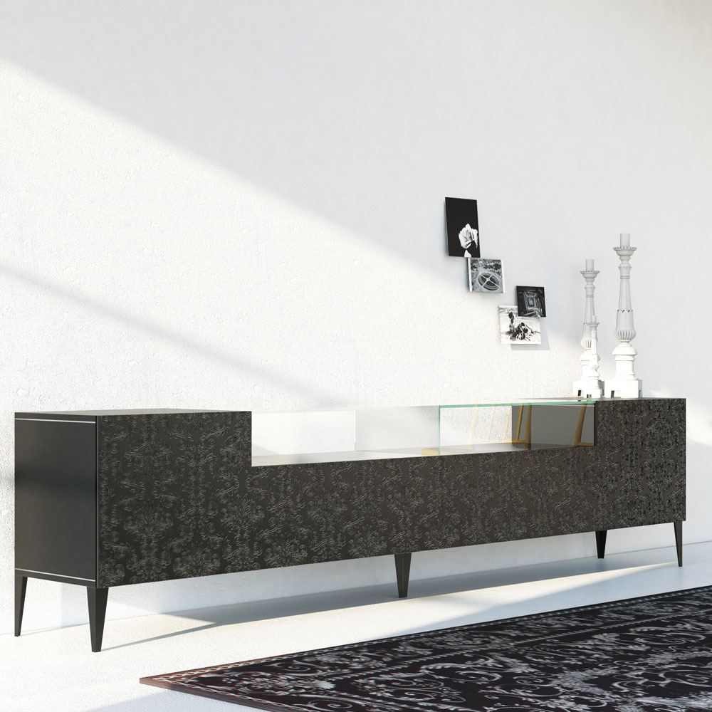 Living room sideboard with structure in matt lacquered MDF and composed of 2 shaped flap doors in matt black lacquer. The case in tempered glass and the feet in black painted metal are included. This product is characterized by functionality and design thanks to its elegant and refined finishes and the unique bas-relief decoration . THE   various materials used for the construction offer great quality and resistance over time, giving the product that unique and unforgettable touch.