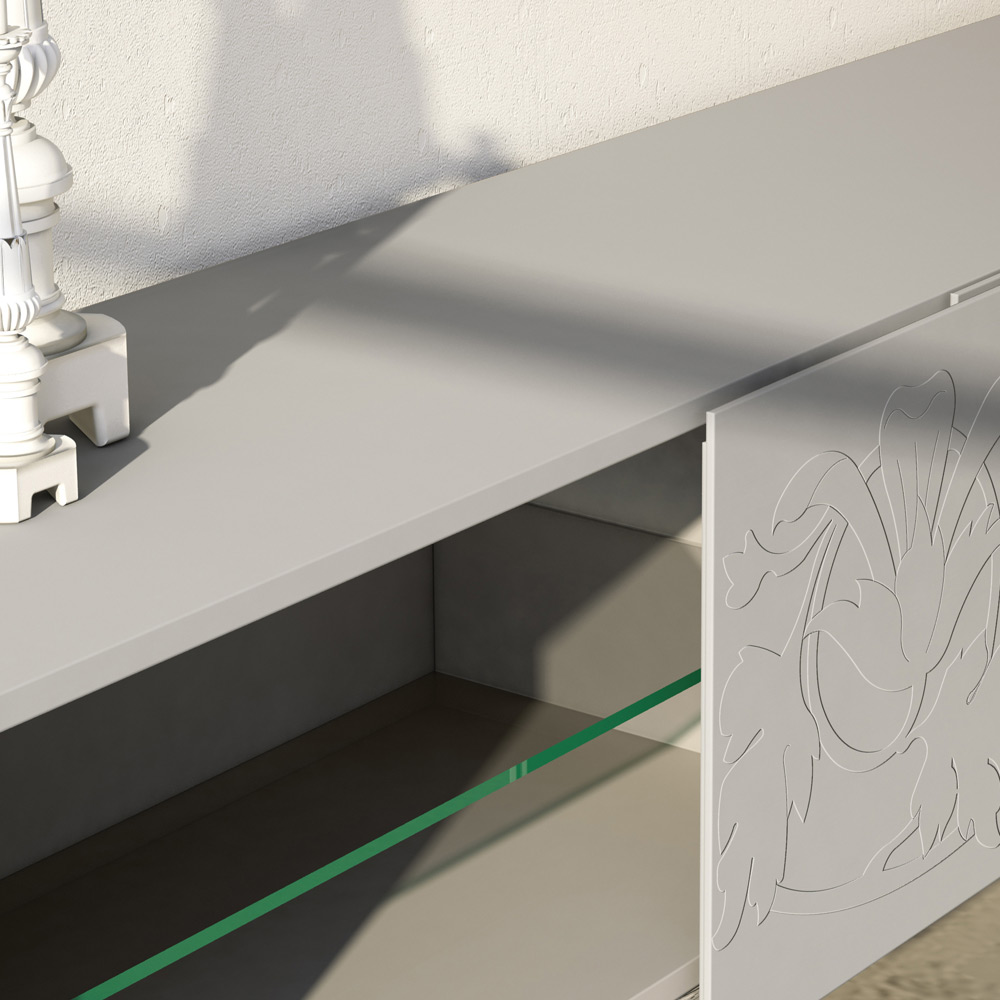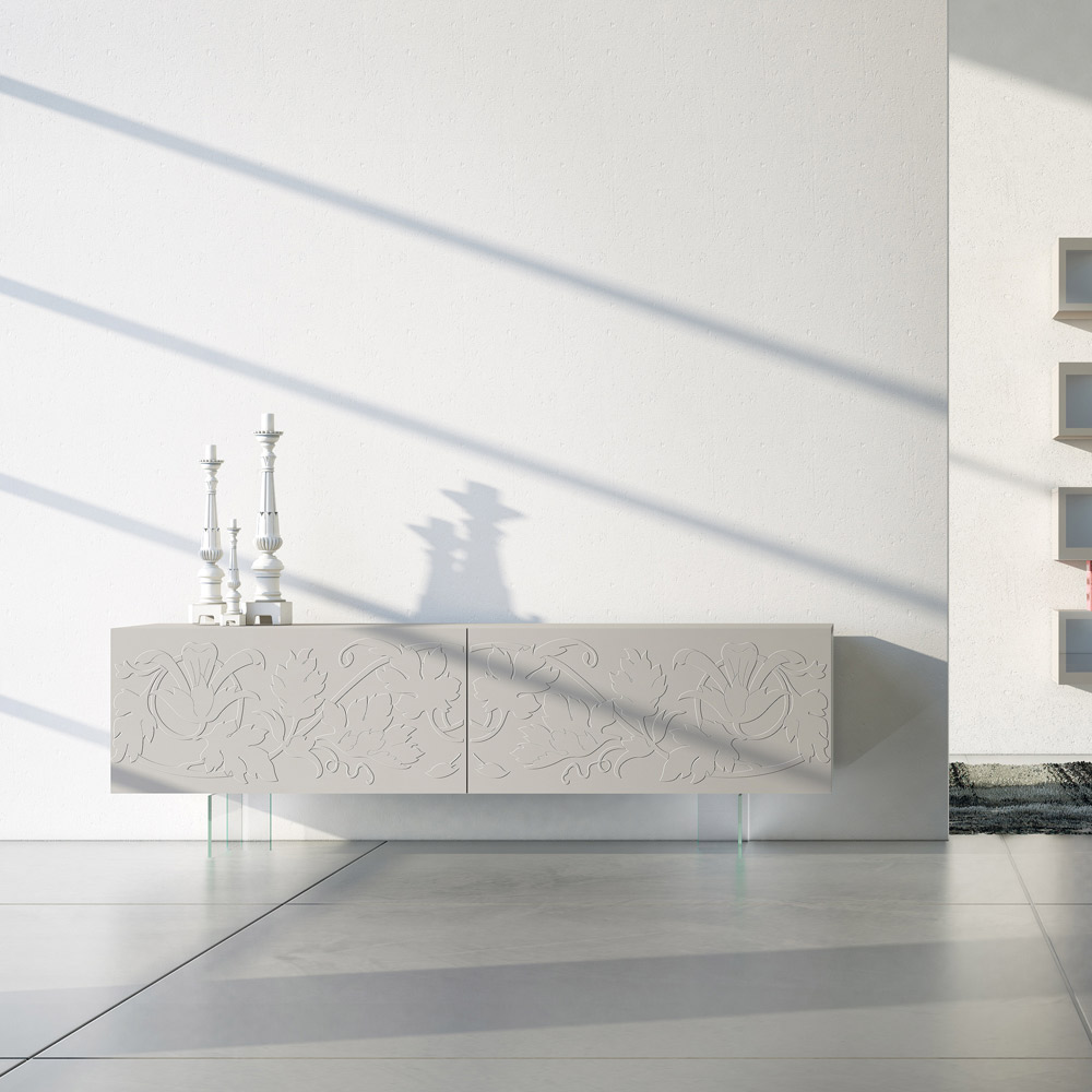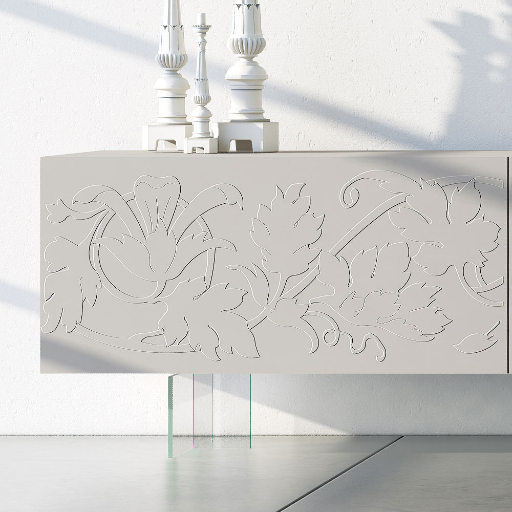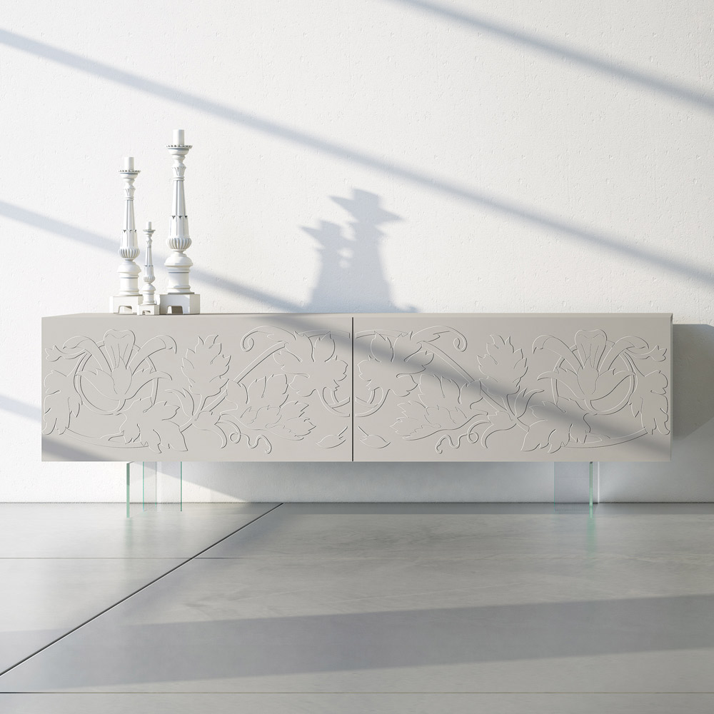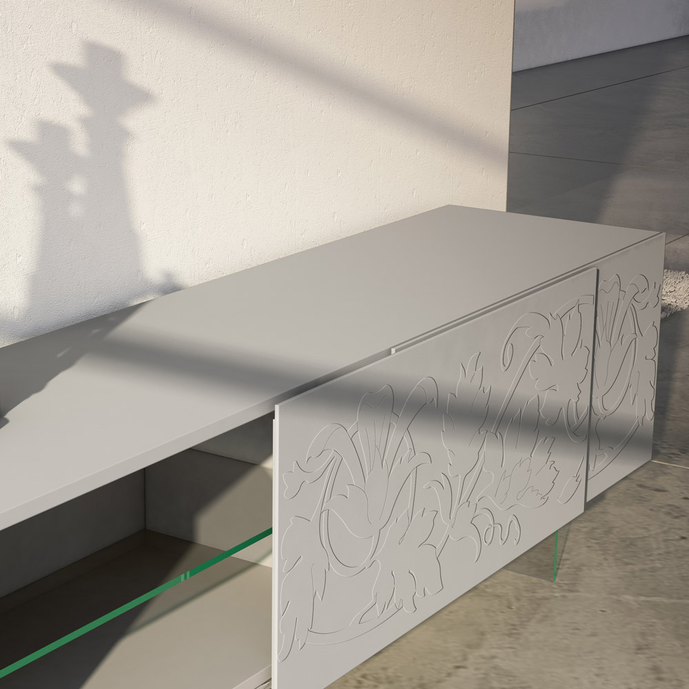 Modern sideboard with white matt lacquered MDF structure composed of 2 coplanar sliding doors   which guarantee great functionality and practicality and with extra-clear glass feet . This product is full of taste and design thanks to its elegant and refined finishes and the unique bas-relief decoration of the doors.   The various materials used for the construction offer great quality and resistance over time, giving the product that unique and unforgettable touch.