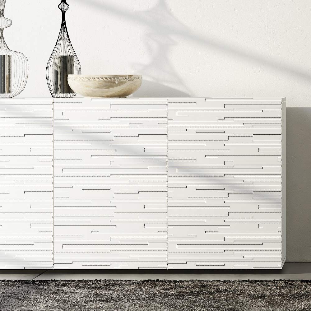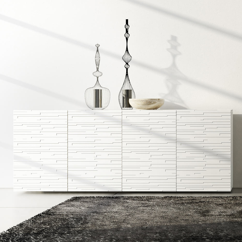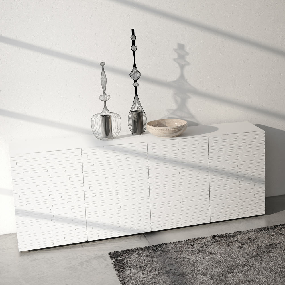 Living room sideboard with matt lacquered MDF structure and with opening system with 4 white matt lacquered hinged doors with bas-relief decoration. This product is characterized by functionality and design thanks to its elegant and refined finishes and the various materials used for its construction which offer great quality and resistance over time , giving the product that unique and unforgettable touch.