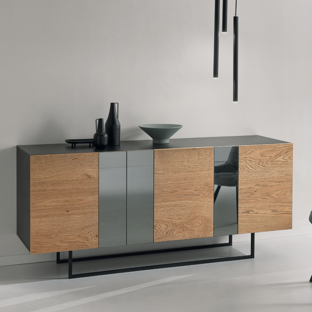 Modern sideboard with structure in anthracite finish melamine , 3 doors in veneered oak enriched by elegant inserts in smoked mirror and black painted metal feet. Made through a Made in Italy production process with fine raw materials , this wonderful decorative element for the living area offers optimal quality , excellent resistance and stability as well as a fascinating and avant-garde aesthetic , proving to be the perfect furnishing solution for those who looking for an elegant and functional piece of furniture at the same time.