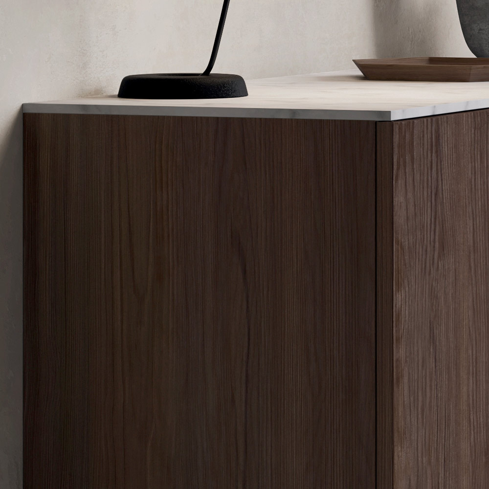 sideboard for the living room has a structure made of terracotta ash and an elegant top in Carrara Venatino marble with a thickness of 12 mm.