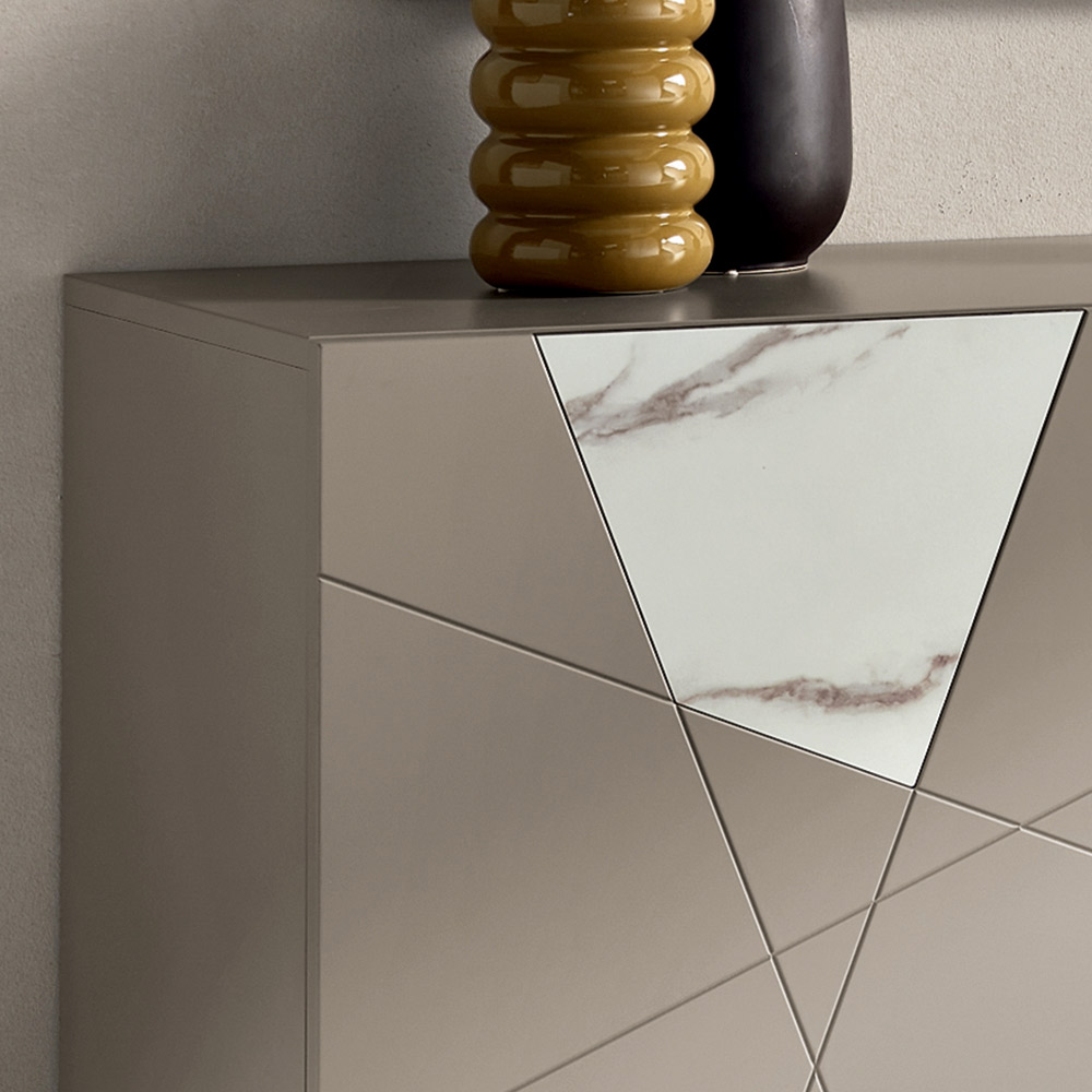 Made in Italy designer sideboard with dove grey finish and marble-effect glass inserts