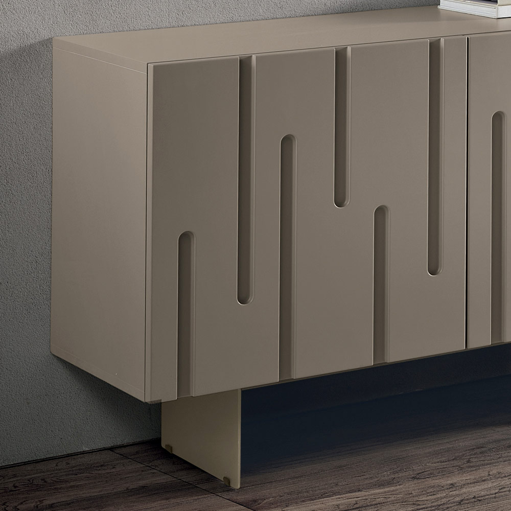 The PVC-coated MDF doors feature irregular vertical incisions that recall the natural flow of stalactites and stalagmites , creating a refined, textured and dynamic effect. This interplay of reliefs gives depth and movement to the surface, enhancing the light and making the sideboard the centerpiece of the space.