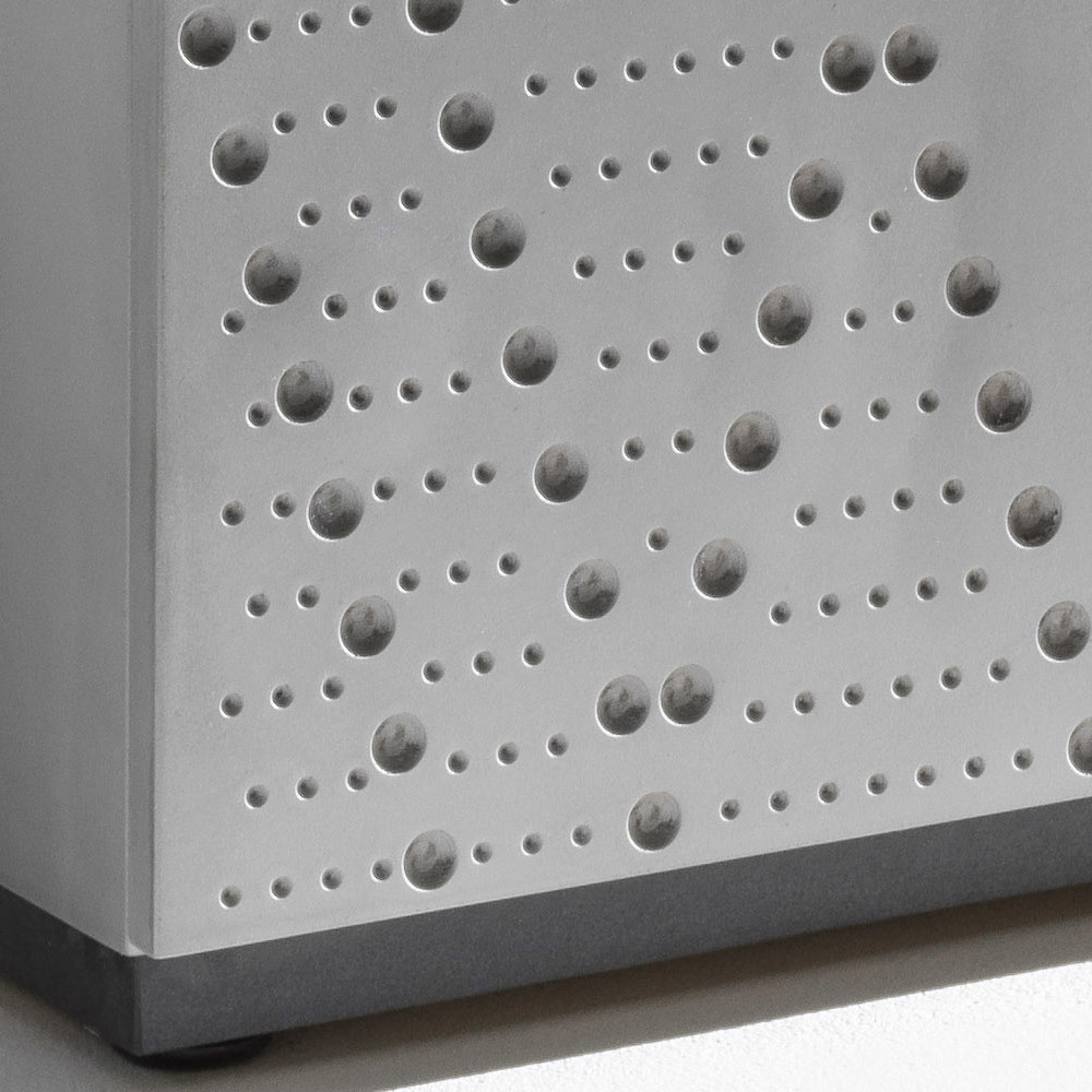 A sideboard with a textured, contemporary feel, defined by a refined, speckled, foundry-look aluminum-effect decoration that covers the doors and creates a sophisticated interplay of light and depth. A dramatic piece designed for modern, elegant, and sophisticated spaces.