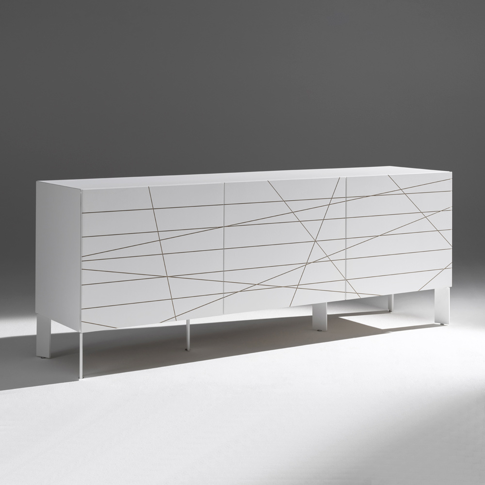 A visually striking sideboard, designed for contemporary and designer spaces. The doors feature a refined engraved graphic design, creating a dynamic interweaving of lines and adding movement to the surface, transforming the piece into a truly decorative element.