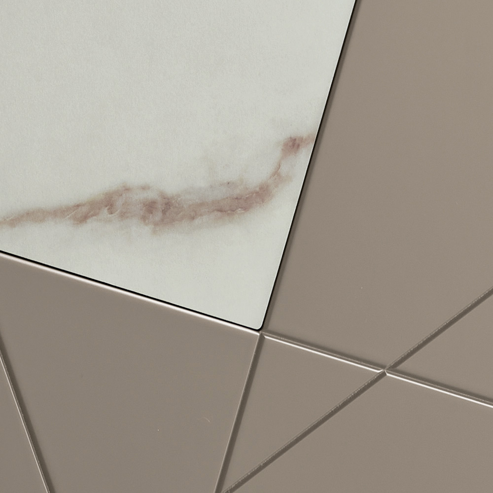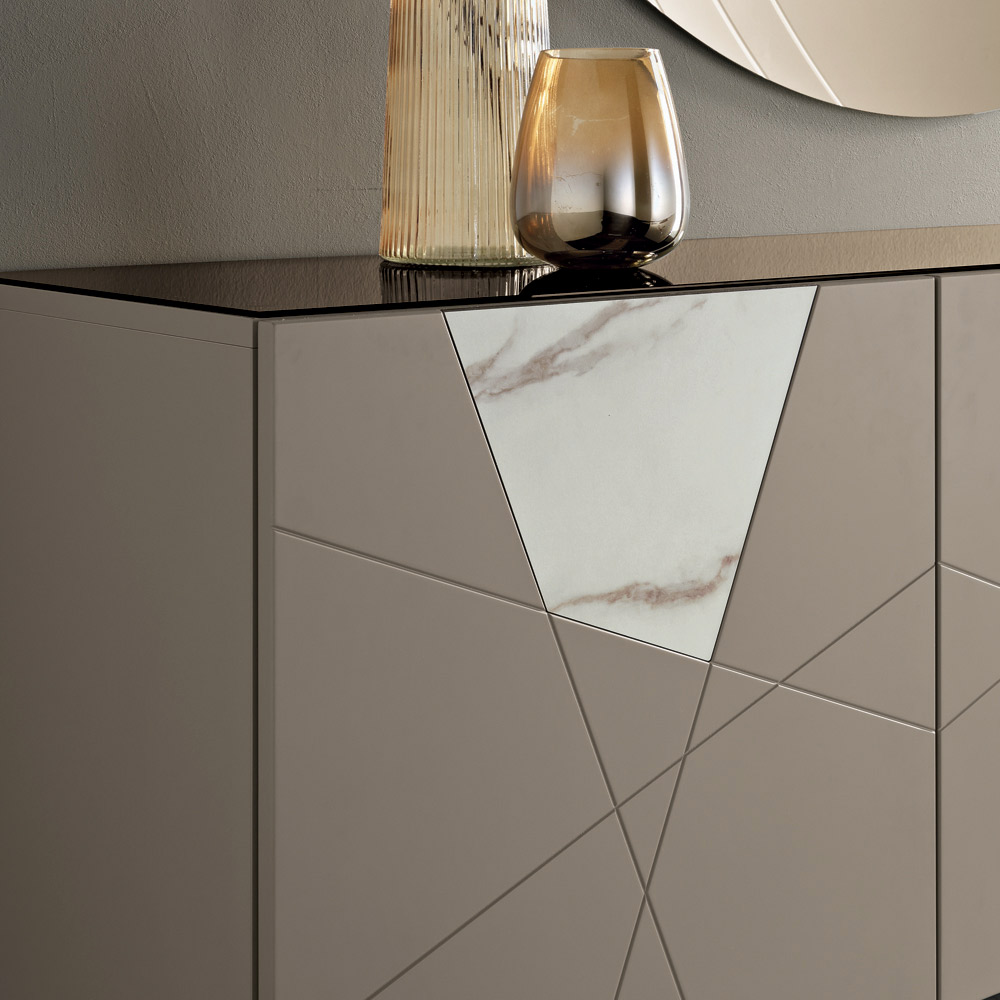 The structure is made of a melamine-faced wood shell, a mirrored glass top, and pantographed MDF doors, featuring decorative engravings that intertwine in an elegant geometric design. Marble-effect glass inserts enrich the surface, creating a sophisticated interplay of graphics and materials.