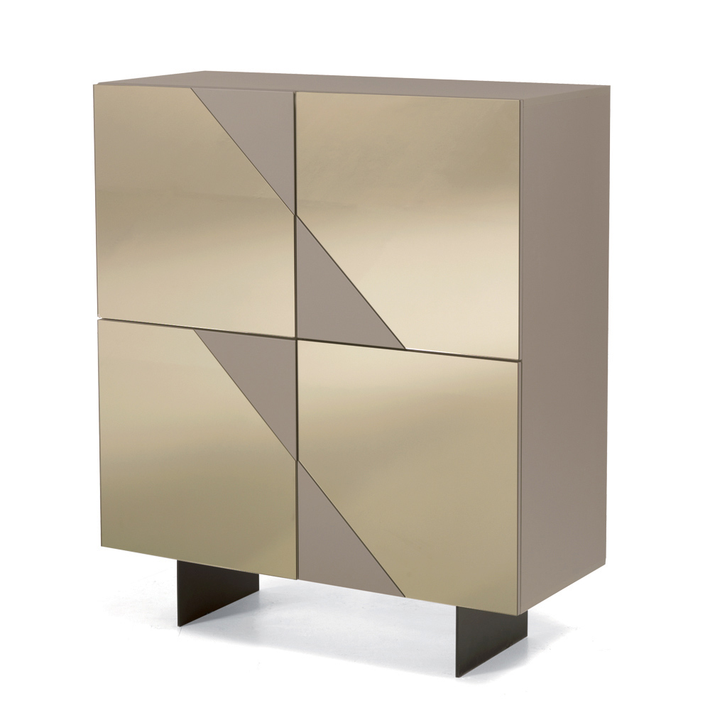 The MDF doors are covered in mirrored glass that alternates glossy and matte surfaces, creating a refined geometric interplay that captures the light and provides visual depth. This contrasting material makes the sideboard elegant and dynamic, perfect for modern and sophisticated spaces.