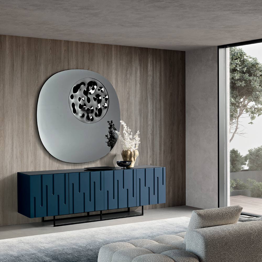 • anthracite body with blue doors and smoked mirror top - sled base in black painted metal 162x38x20 cm