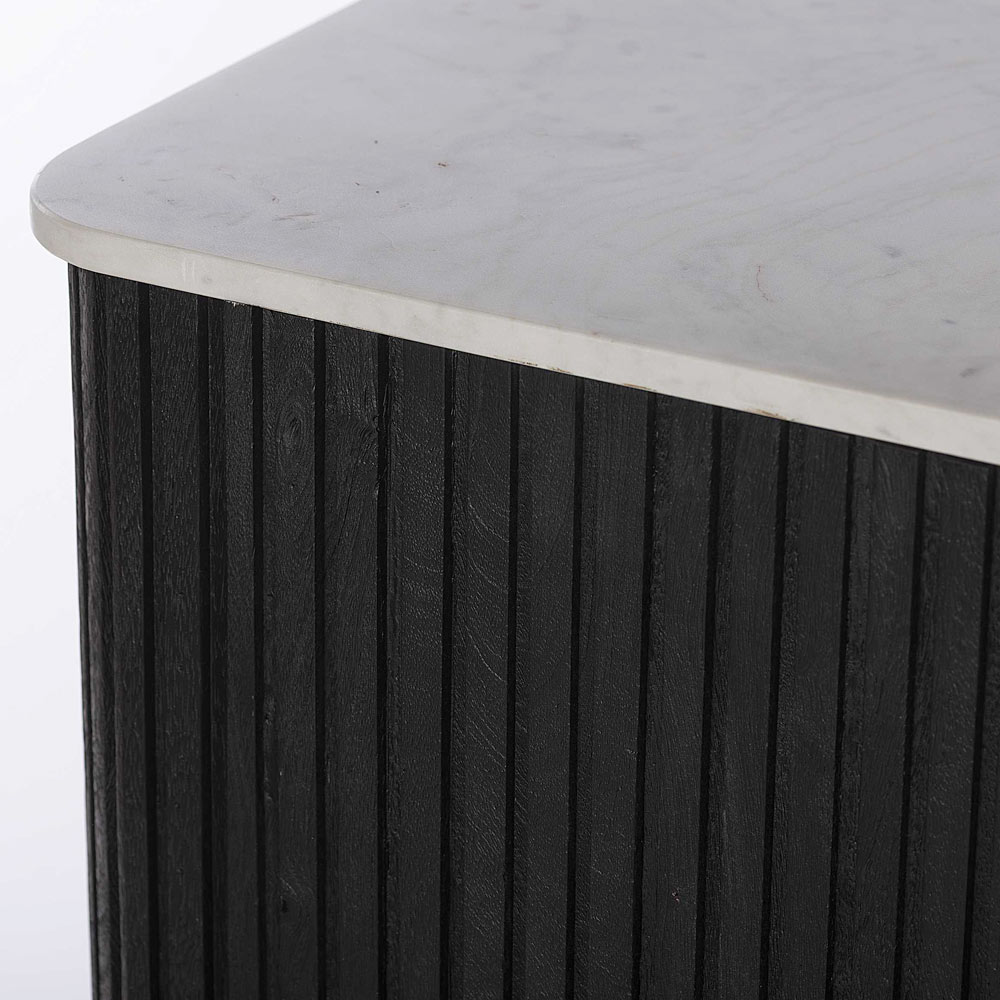 This elegant storage unit combines modern design with timeless sophistication , making it the perfect addition to any sophisticated space. The black fluted wood frame creates a fascinating three-dimensional effect, which immediately catches the eye and adds aesthetic depth to the piece.