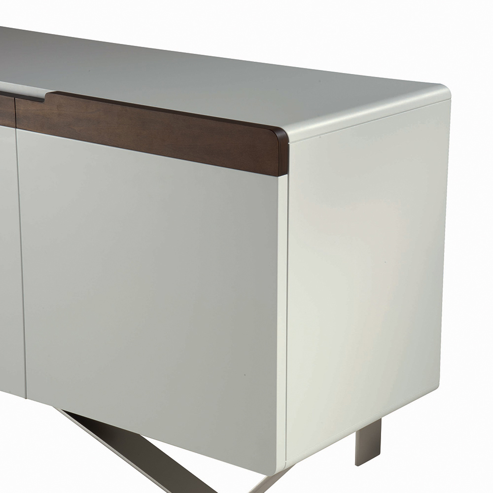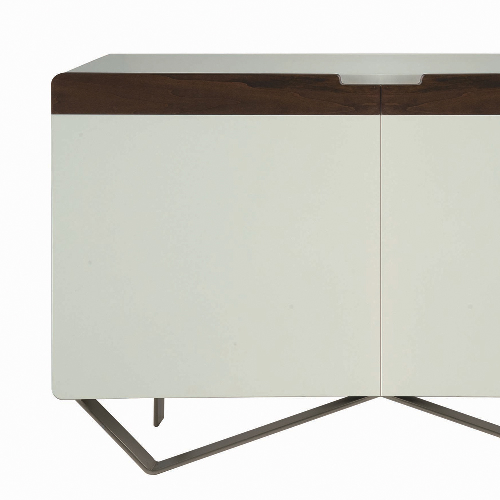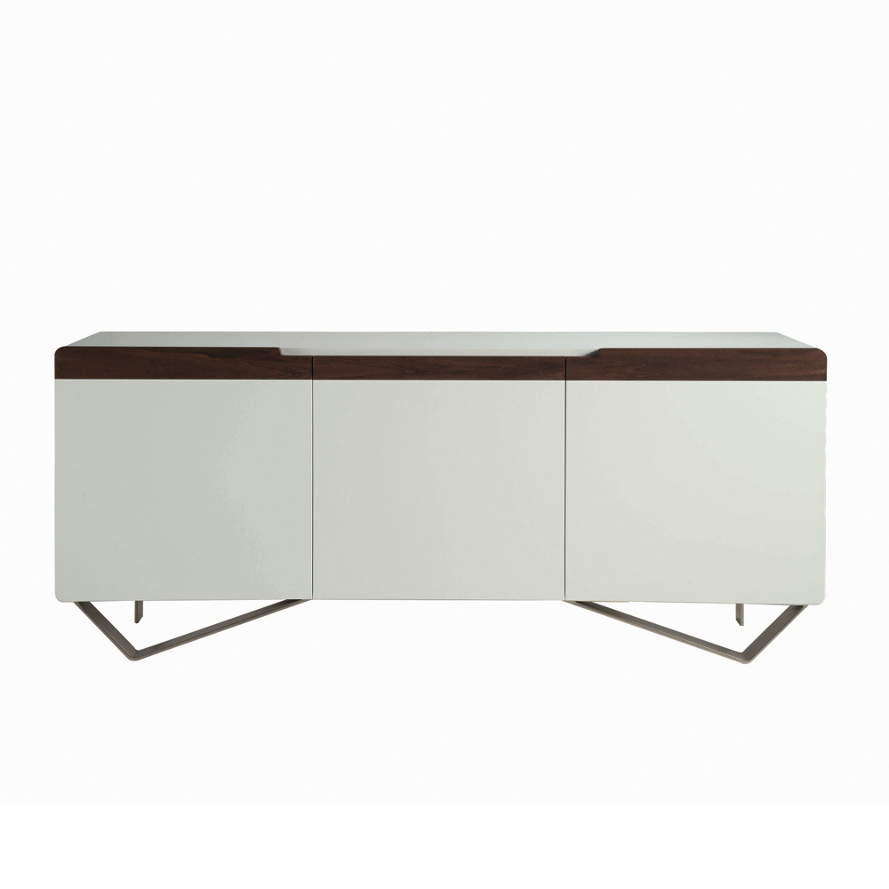Living room sideboard entirely made in Italy with iron feet in nickel finish , shell in white mdf complete with doors with handle in solid tulipier wood with canaletto finish   made in Italy through the use of quality workmanship and materials combined with the refined taste of a contemporary design. This sideboard is available in two different sizes with two or three doors and internal shelves.
