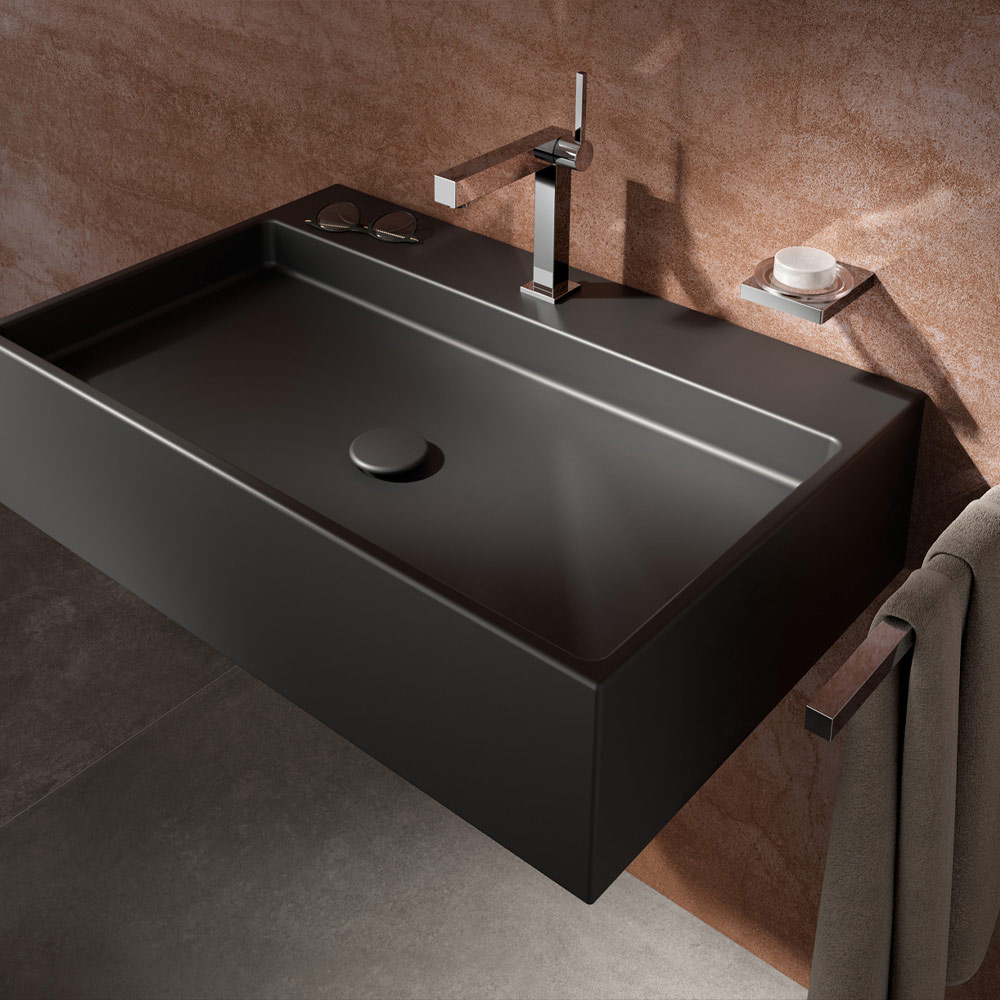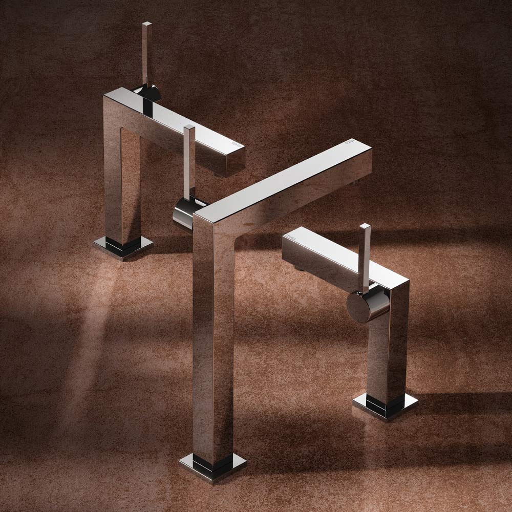 This single-lever basin mixer features a square design on square elements available in 3 different sizes.